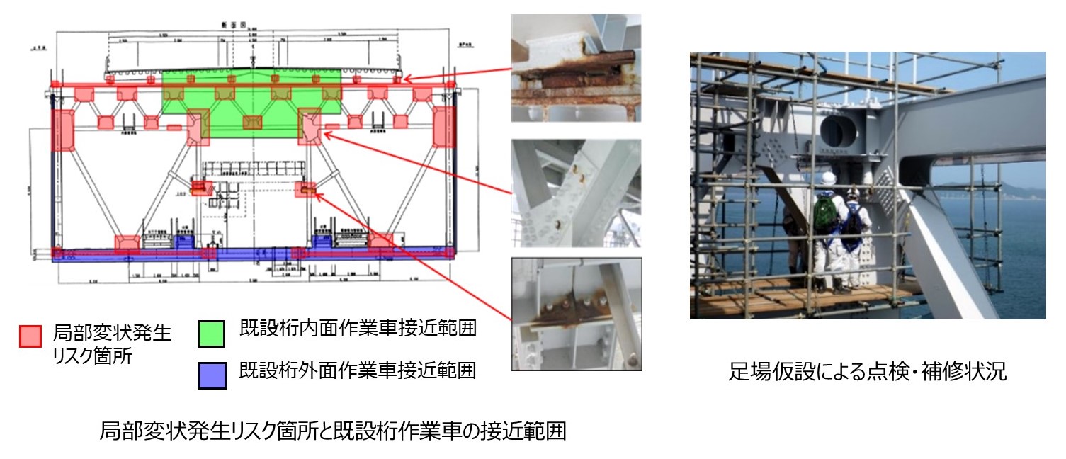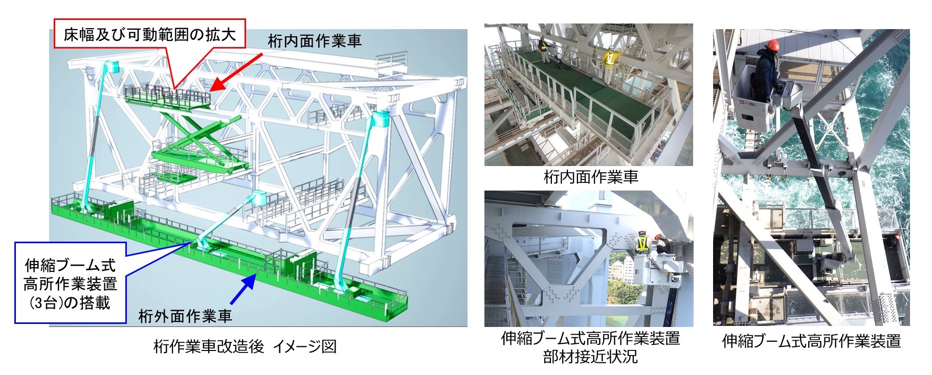 磯江 これまで桁作業車で接近できない変状箇所を補修する際には吊り足場を設置する必要がありましたが、資機材の落下リスクや施工費の高騰が危惧されていました。そこで、現状の桁作業車を改造して補剛桁部材への近接率の向上を図るために、桁外面作業車は側面フレームを撤去して、下面作業台に高所作業車のような伸縮ブーム式高所作業装置を3台設置することで、補剛桁の内外面や全高も見られるよう改善しています。桁内面作業車も橋軸直角方向に伸縮する足場がありましたが、足場の床幅の拡幅と可動範囲を拡大する改造を行っています。それらにより、補剛桁部材の近接率が40%から90%程度に向上しました。近接点検・補修・塗装を行いたい箇所は、桁内面作業車の場合2台を使用すればほぼ対応できます。