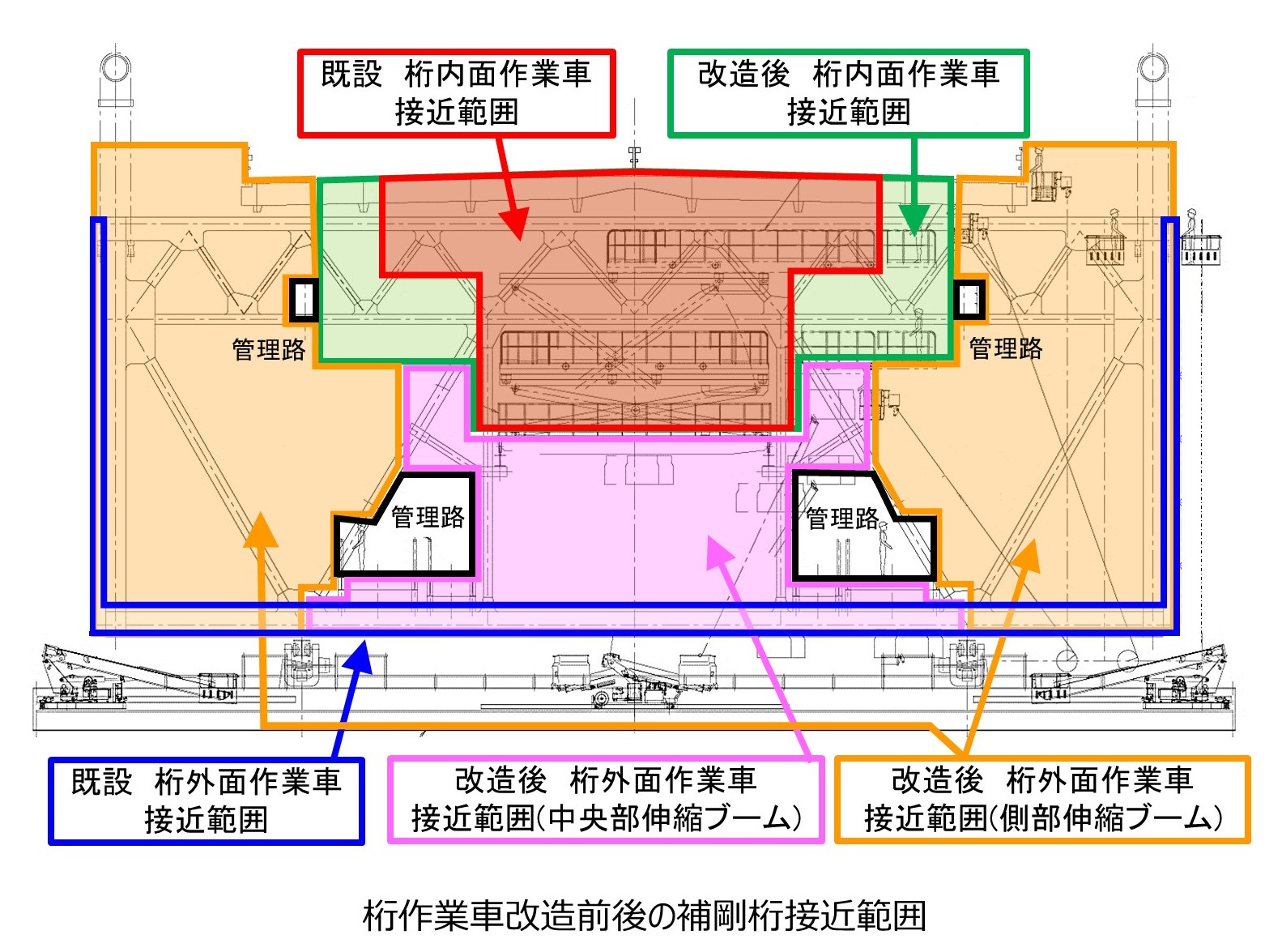 大鳴門橋桁内・外面作業車の改造前後のアプローチできる範囲