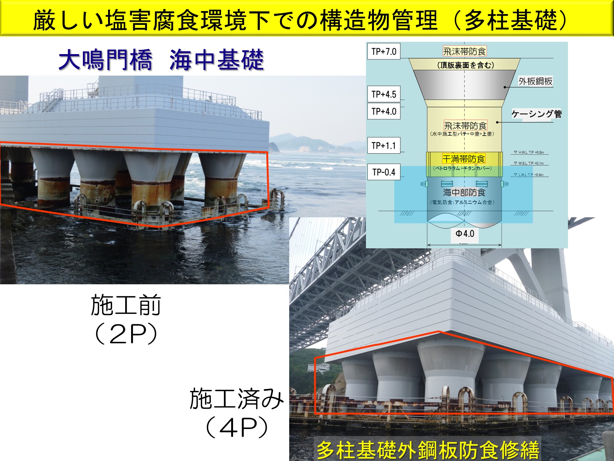 瀬戸大橋の鋼ケーソン、大鳴門橋の多柱基礎の鋼管については、内部にコンクリートが充填されているので、なくなってもコンクリートがしっかりしていれば問題ないというのが当初の考えでした。しかし、想定される地震の規模が大きくなり、耐震照査すると鋼管がないと耐震性が確保できないことから、現在は鋼管を維持するために防食対策をしています。