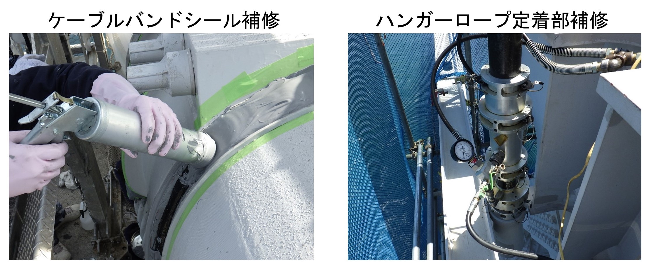 磯江 主なものでは、大鳴門橋では、補修塗装、ケーブル類補修(ケーブルバンドシール補修、ハンガーロープ定着部補修など、下図・写真)を継続して行っています。門崎高架橋では、鋼床版疲労き裂補修を実施しています。現在、大鳴門橋の鋼床版疲労き裂を調査していますが、亀裂は確認されていません。