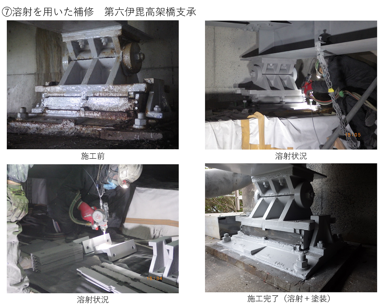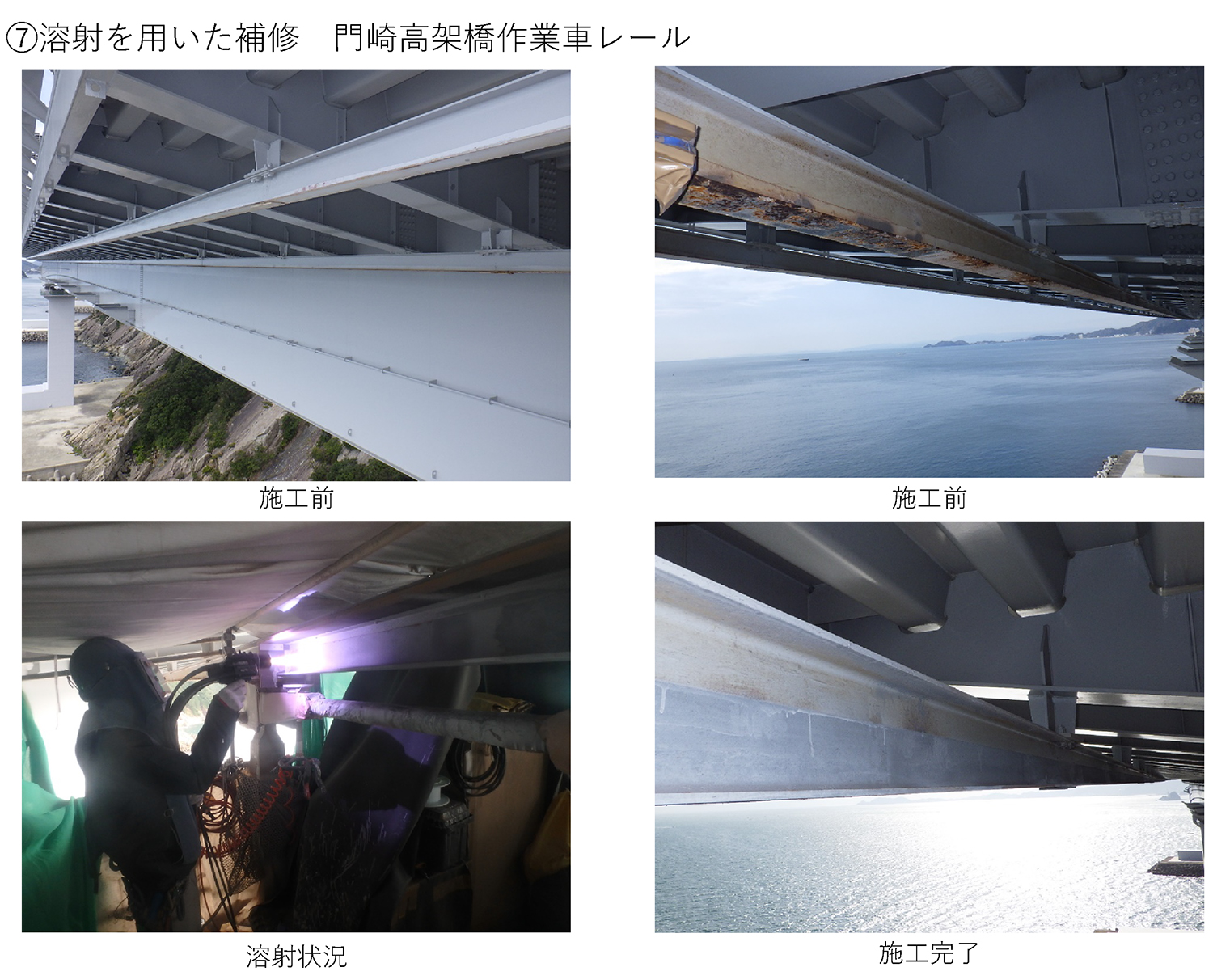 門崎高架橋の例ですが、作業車が走るH型レールが腐食して断面欠損してくるので、レールを維持するために溶射をしています。