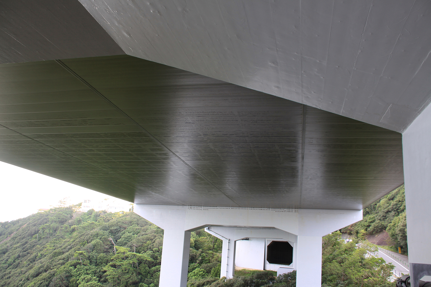 塗替えではありませんが、孫崎高架橋では、上下合わせて14主桁の鈑桁橋であり、塗り替えに大きなコストを要するため、それを削減することと維持管理性の向上を図り、チタン製のカバープレート(『NSカバープレート』)を採用し桁全面を覆いました。