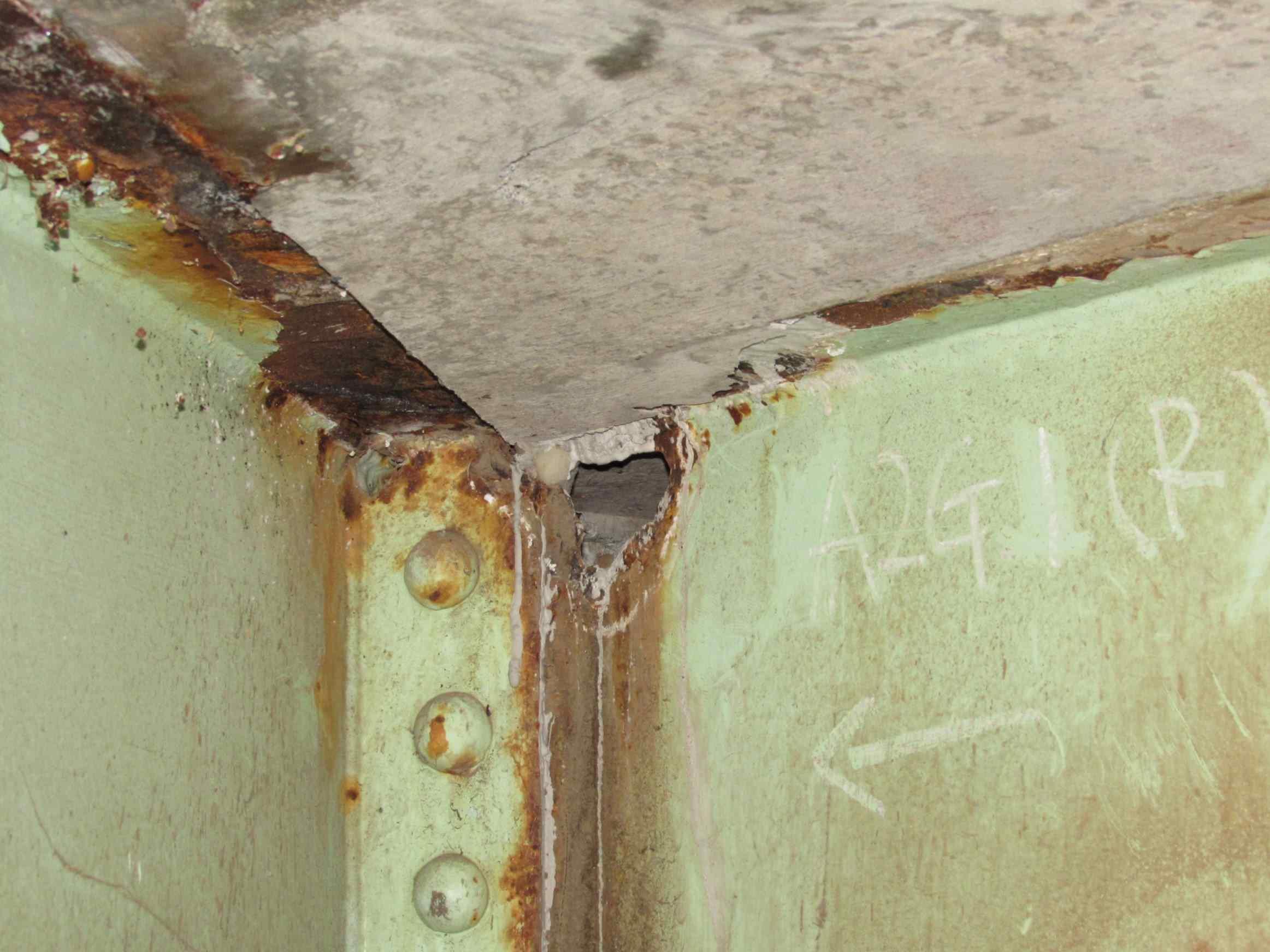 部位ごとの損傷としては、桁は上記の損傷、床版は防水機能の未施工に起因するコンクリートの土砂化、下部工では剥離・鉄筋露出、ひび割れ、地覆については塩害および車両の衝突などによる剥離・鉄筋露出、ひび割れ、高欄は塩害による腐食が確認されています。
