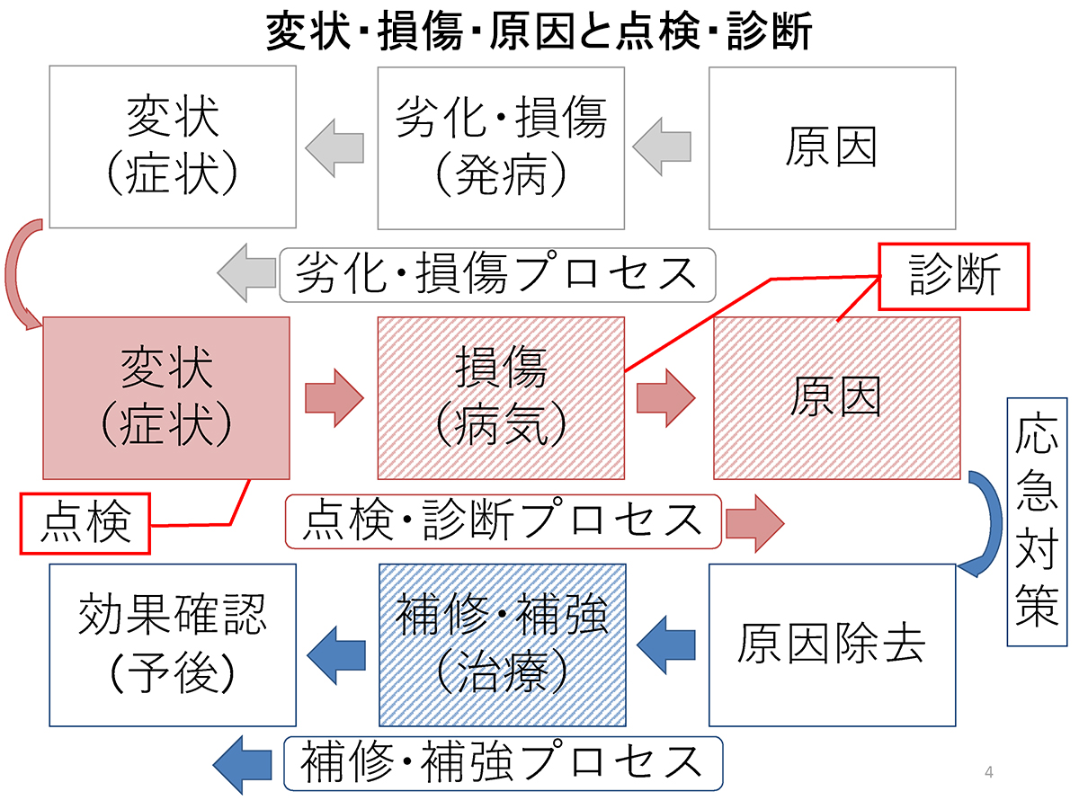 橋の損傷種類を1日かけて書き出すたら48種類ありました。本当はもっとあると思います。それを全て発症から症状の進展、最終的な破壊状況を全部明らかにする、明らかになっていないものは仮説を立てる、それをCAESARのみんなに手分けしてやってもらっています。それなくしてはAI自身で独自に判断することはできませんから。これらをエキスパートシステムに全部詰め込んで、点検結果である変状(=症状)がどの損傷のどの段階に当てはまるかを診断でき、その理由を説明できるシステムを作ろうとしています。