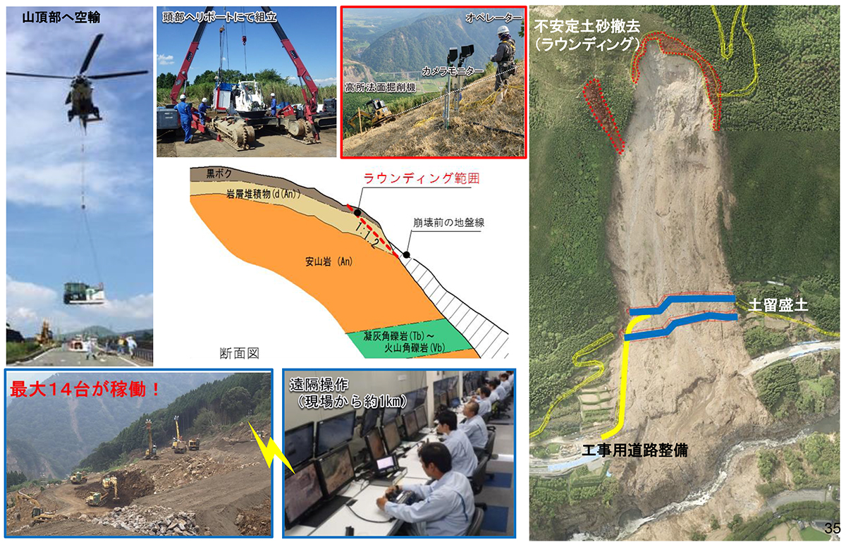 翌5月からは二次災害を防止するため斜面中腹に土留盛土工を施工するとともに、頭部の不安定土砂の除去を行う緊急復旧工事に着手しました。土留盛土工については、雲仙普賢岳で施工した砂防事業を中心に発展した無人化施工技術を活用しています。大規模崩落斜面から約1km離れた安全な場所から遠隔操作を行い、最大で14台の重機が同時に稼働していました。不安定土砂の除去についても、オペレーターが山頂の安全な場所から高所法面掘削機を遠隔操作し施工を行いました。