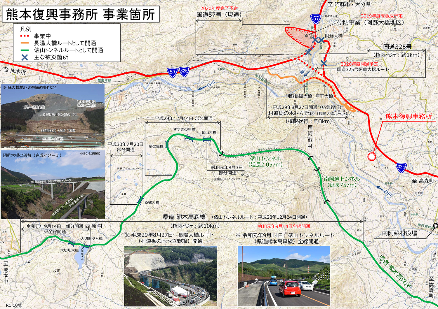 大榎所長 所管しているのは、砂防事業として阿蘇大橋地区大規模崩落斜面の斜面対策、道路事業として国道57号現道部、国道325号(阿蘇大橋架替)、県道熊本高森線(俵山トンネルルート)および村道栃の木~立野線(長陽大橋ルート)の復旧事業です。国道57号現道部以外の道路事業についてはすべて権限代行事業です。