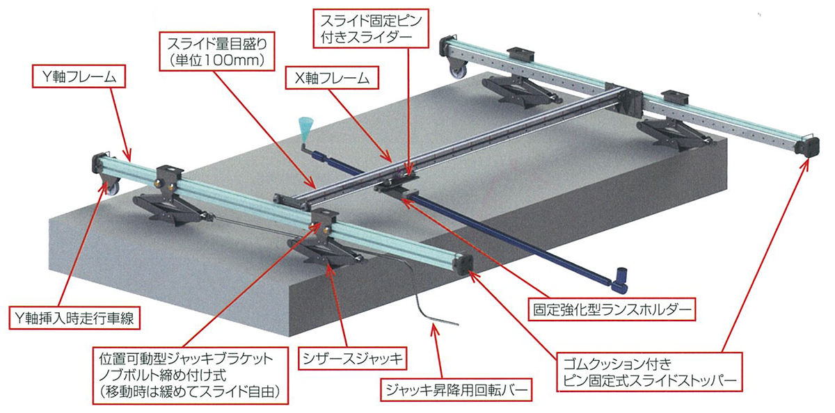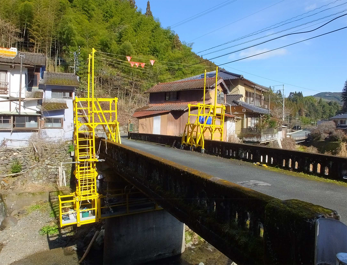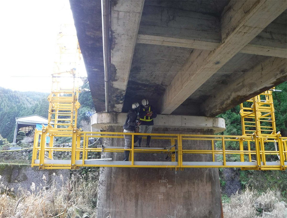 ブリッジハンガーも橋梁定期点検時に、市町村の幅員の狭い橋梁では橋梁点検車を設置すると救急車も通れなくなります。それを解決するために何かできないかと考えたものです。補修・補強の専門業者・エスイーリペア、建機レンタルの西尾レントオールなどと一緒に開発しました。