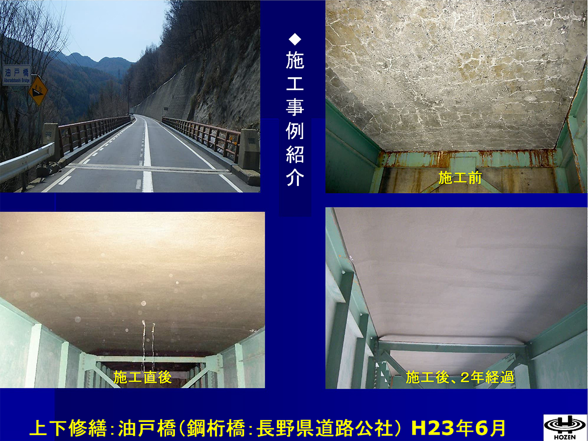 牧角 本四高速では30年以上の実績になります。非常にいい製品ですが、似たような被覆材はたくさんあります。特殊性というかLCCを考慮される本四高速ですと、十分コストパフォーマンスがいいのですが、単なる被覆材であるならば、単純で安価なものもあります。本四高速では30年経過しても効果を発揮していることはすごいことです。その意味でも公共事業に限らず、民間のプラントや基地などにも広めることが重要と、協会内で話をしています。最近では、大阪メトロでも採用されて広まりを見せています。