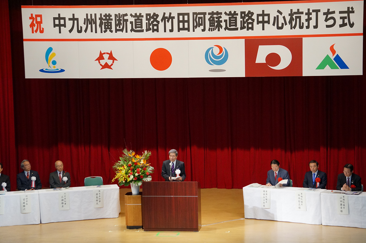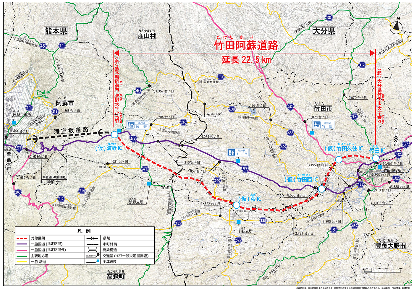 竹田阿蘇道路は、起点が大分県竹田市大字会々、終点が阿蘇市波野大字小地野の延長22.5kmの道路で滝室坂道路と接続します。熊本県側は2019年度に事業化され、2019年11月に中心杭打ち式を行いました。今後、調査、設計を進めて、できるだけ早く工事に着手できるようにしていきます。