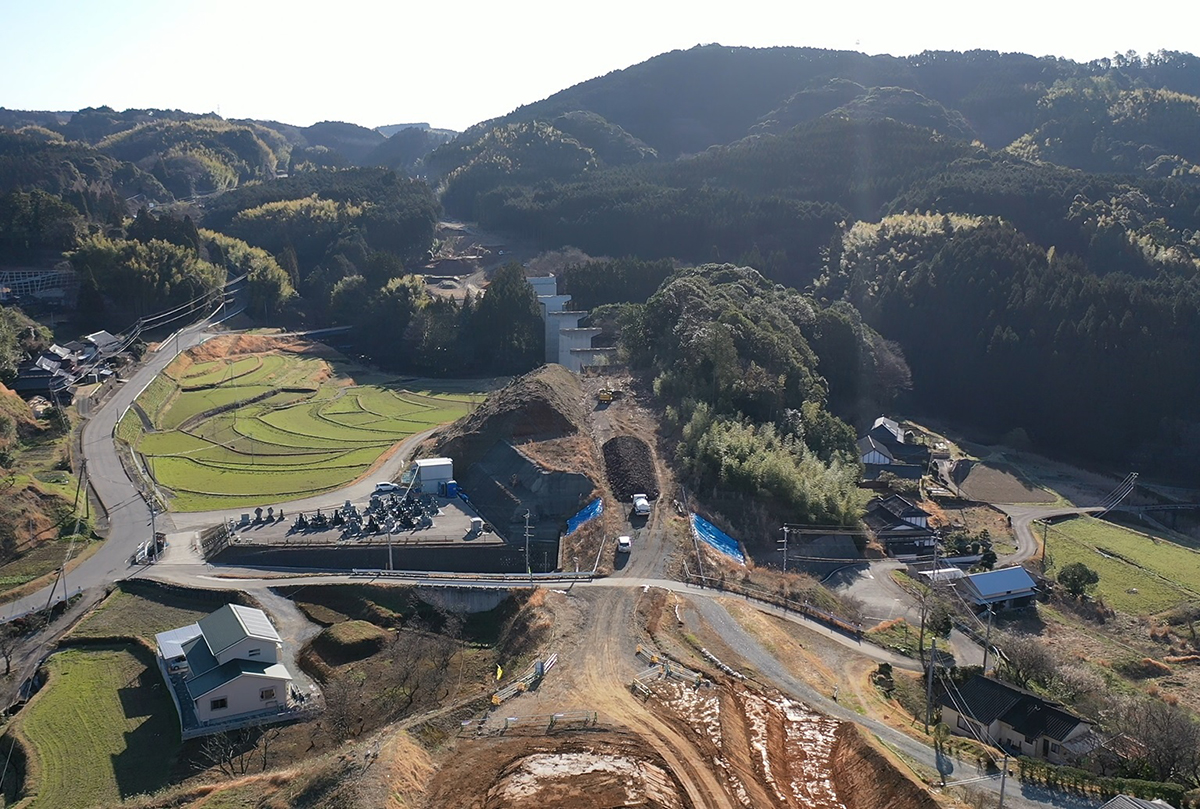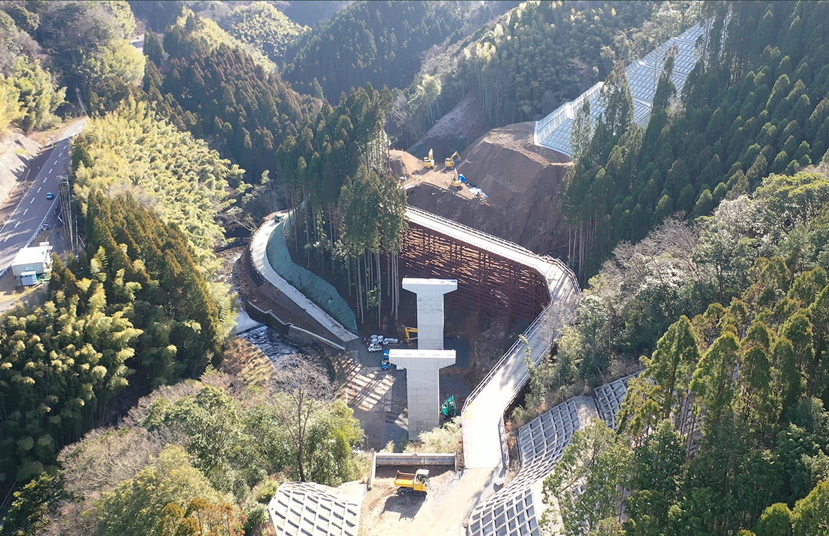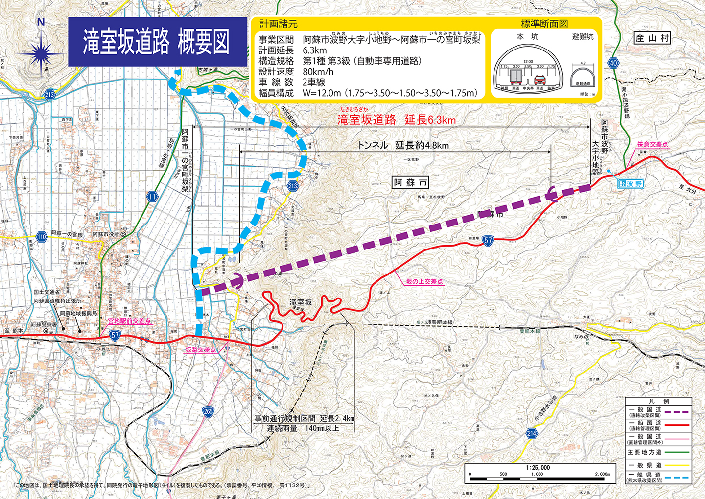 滝室坂道路の事業区間は、阿蘇市波野大字小地野~阿蘇市一の宮町坂梨で延長6.3kmです。そのうち、4,834mが滝室坂トンネルとなり、延長比率で約77%を占めています。阿蘇の外輪山東側の非常に脆弱な地盤のところを掘削していますので、慎重な掘削を進めていますが、事故なく1日も早く開通ができるように考えています。