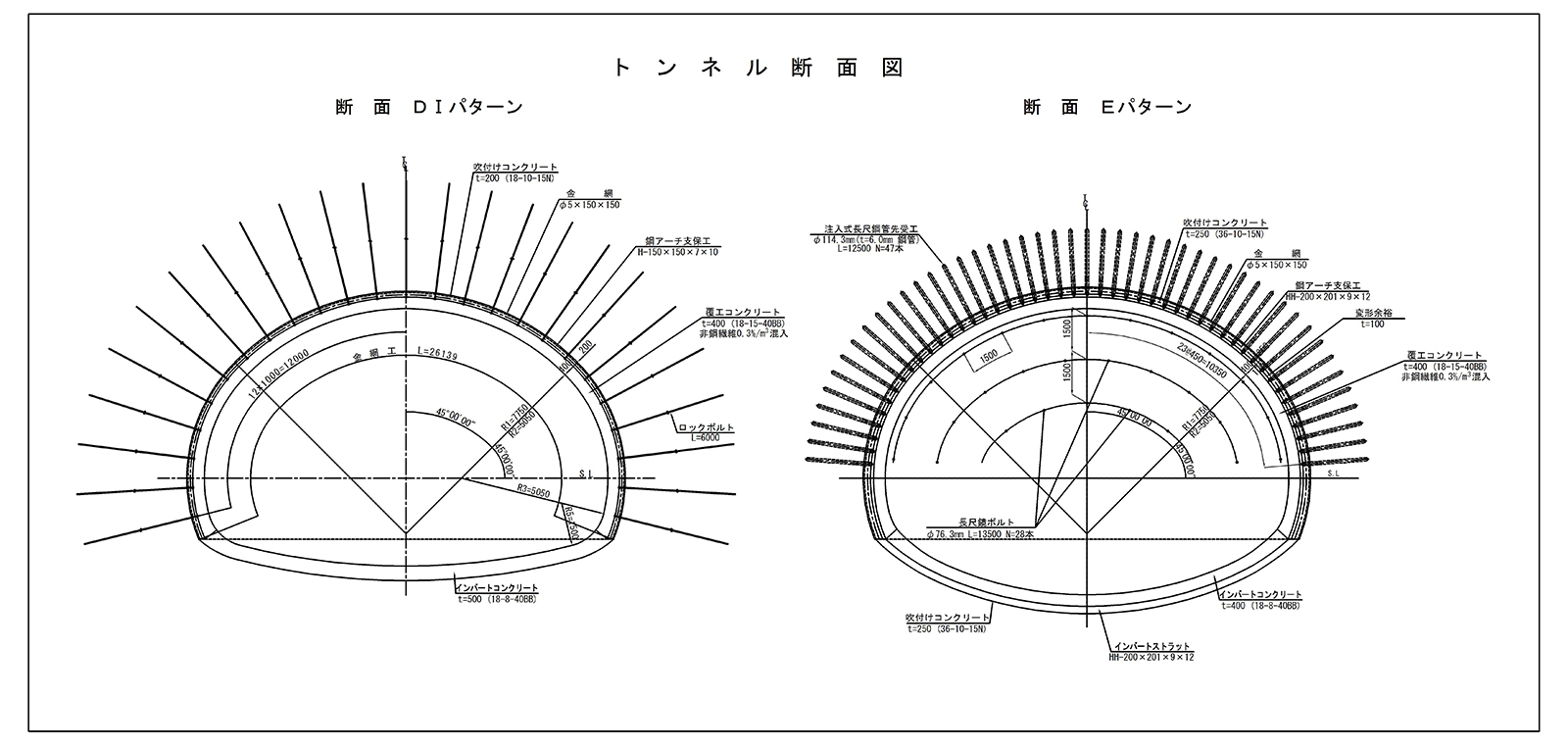 鈴木 切羽判定を実施したところ、東工区本坑において、切羽面に脆弱な砂礫層が分布し、沈下量が大きくなったことから、Eパターンを採用しました。Eパターンとは、高強度の支保工とするとともに、補助工法でAGF工法(注入式長尺先受工法)や長尺鏡ボルトを施工し、かつ断面を円形に近づけ、外圧等に耐えうる構造としたものです。全延長は本坑4,834m、避難坑4,898mで、西工区と東工区の2工区で施工しています。西工区は本坑2,679m のうち452.4m、避難坑3,069m のうち1,109.4m、東工区は本坑2,155m のうち594.1m、避難坑1,829m のうち1,293.5mまで掘削が進んでいます。