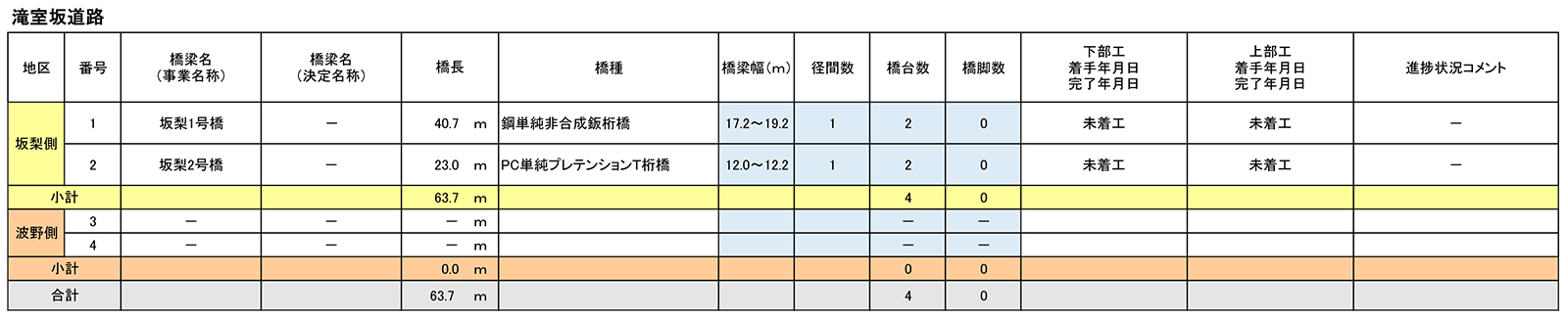 鈴木 坂梨1号橋(40.7m、鋼単純非合成鈑桁橋)と坂梨2号橋(23m、PC単純プレテンションT桁橋)の2橋で、未着手です。