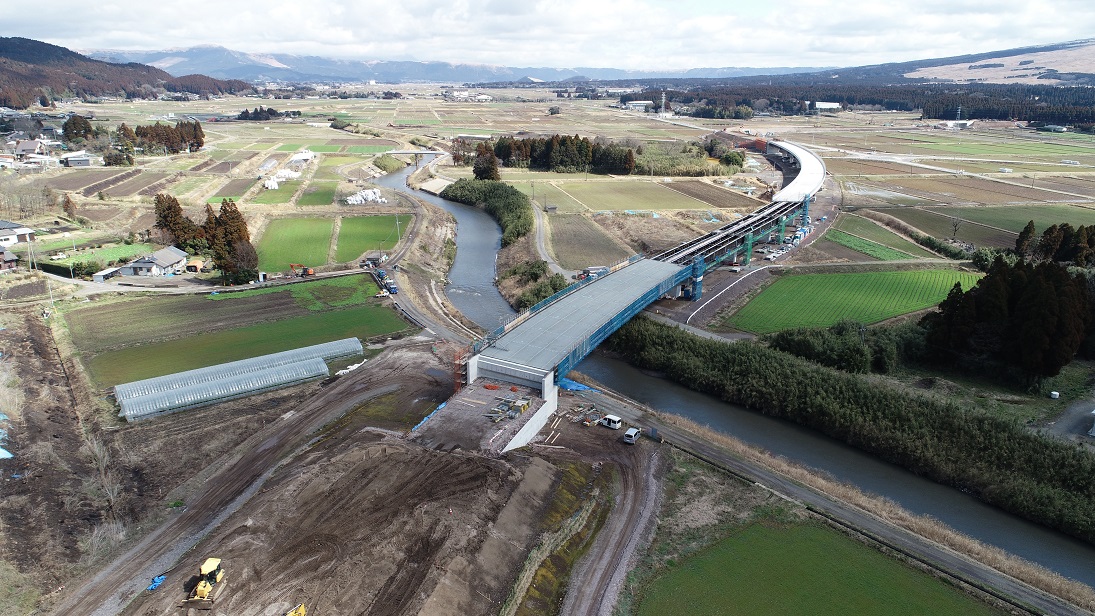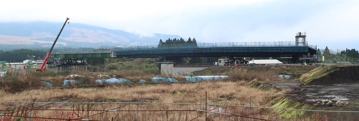黒川高架橋の黒川渡河部では曲線桁約83mを送り出し架設
