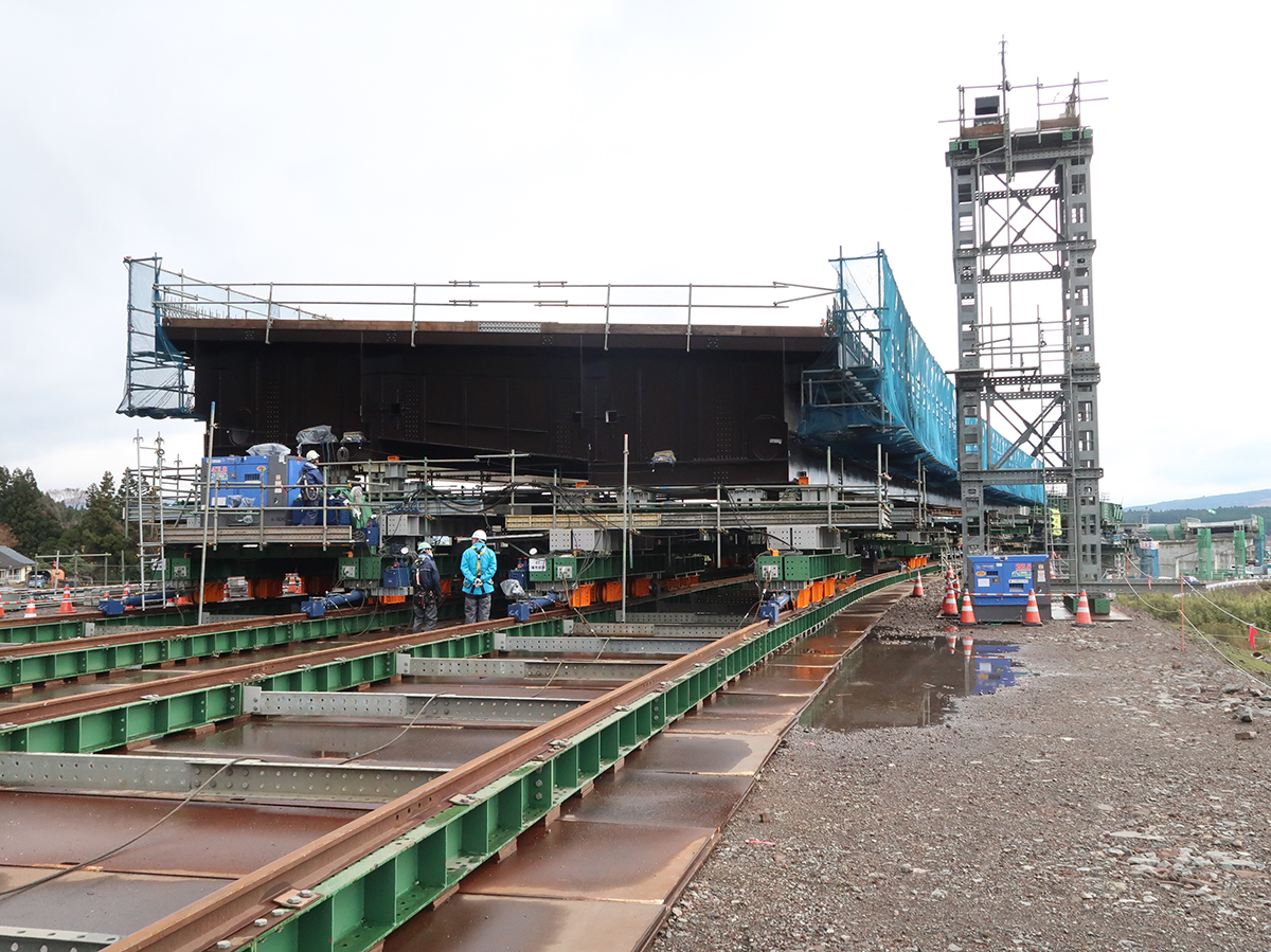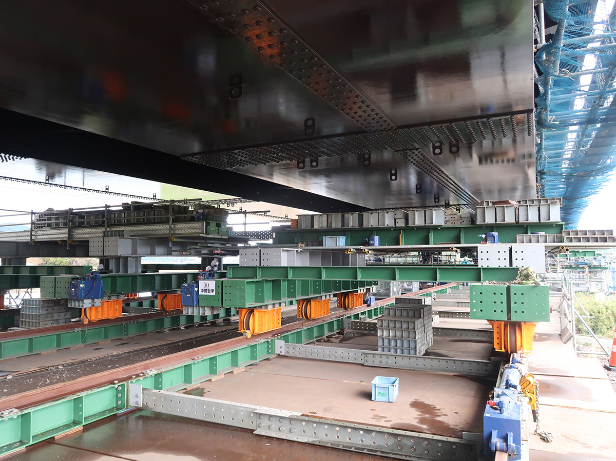 単曲線でなく桁幅を変化する桁の送り出しには慎重な施工が求められた(右下以外、大柴功治撮影)