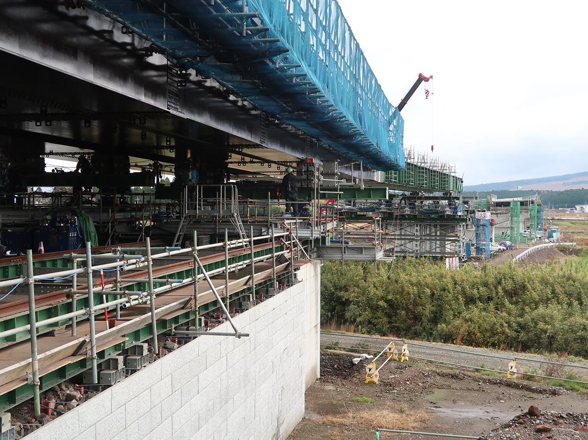 鈴木 桁が単曲線ではなく、さらにA2方向に桁幅が拡幅していたため、桁が移動するたびに重心や反力が変化しました。そのため、1mごとに反力計算と安定計算を行い、その都度、支点位置の調整を行わなければならず、慎重な施工が求められました。