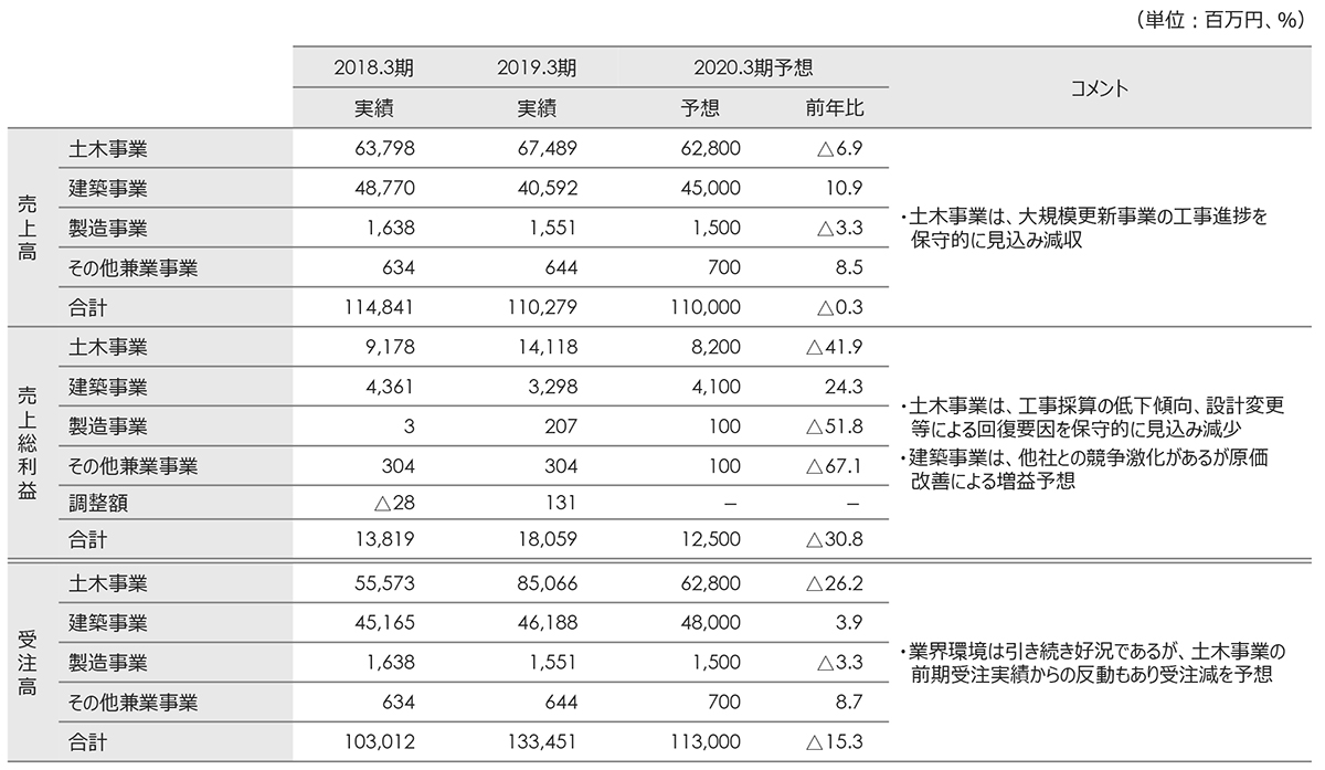 森 土木事業は受注高、売上高ともに第2四半期の決算説明では628億円を予想しています。受注高(2019年3月期実績851億円)は、前期受注実績からの反動もあり、223億円の減少を見込んでいます。