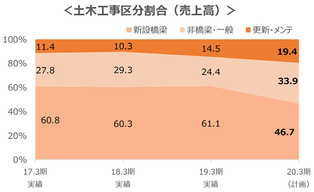 森 売上高ベースで2019年3月期は約15%だったものが、2020年3月期は約20%になる予想です。2020年3月期予想では土木事業のなかで新設橋梁の占める割合が約半分に減少しています。その傾向は続き、新設橋梁以外で相当な割合の売上を上げる会社になっていくと思います。