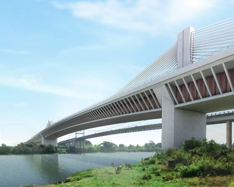 森 ひとつは、2018年度に受注したミャンマーのジャイン・コーカレー橋です。橋長は580mで、メイン橋梁(380m)はPC3径間エクストラドーズド橋で波形鋼板ウェブとストラットを併用するというチャレンジングな構造になっています。アプローチ橋梁(100m+100m)は鋼2径間連続少数鈑桁橋となります。安藤ハザマとのJVで、工期は2019年5月から2021年7月までの27カ月です。