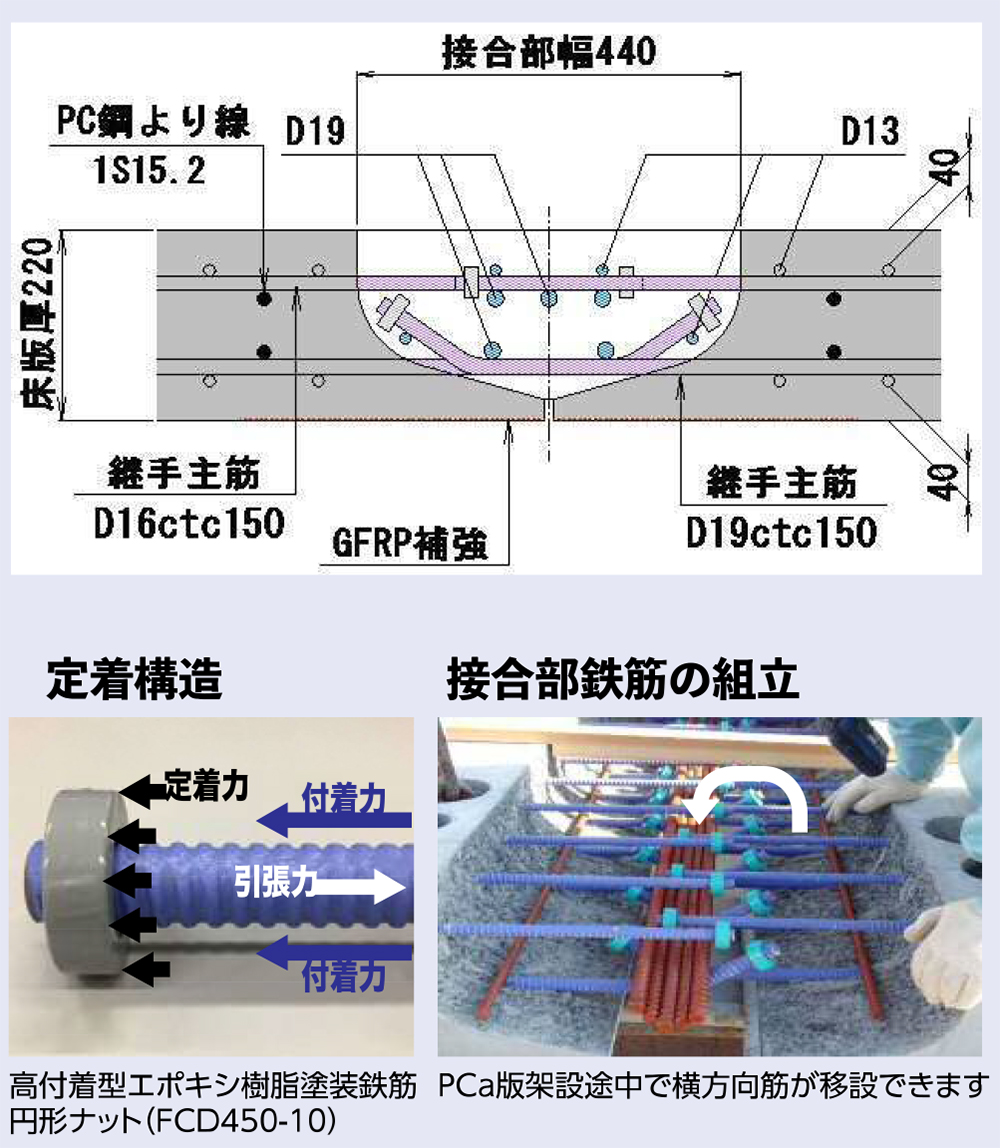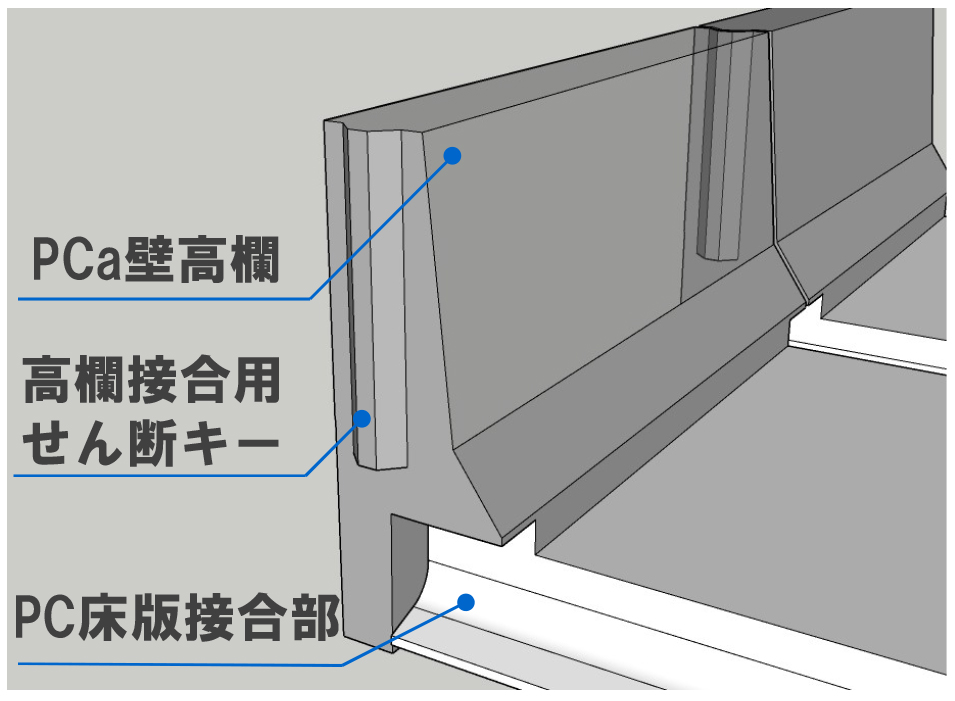 フルキャスト壁高欄は、壁高欄のために打設はしないというコンセプトで開発したものです。PC床版にあらかじめ壁高欄を構築して架設しますので、PC床版の架設が完了したら壁高欄も架設されている状態になり、大幅な省力化が可能です。高欄接合部はせん断キーを用いて荷重を伝達する構造で、架設後に目地部にモルタルを充填します。