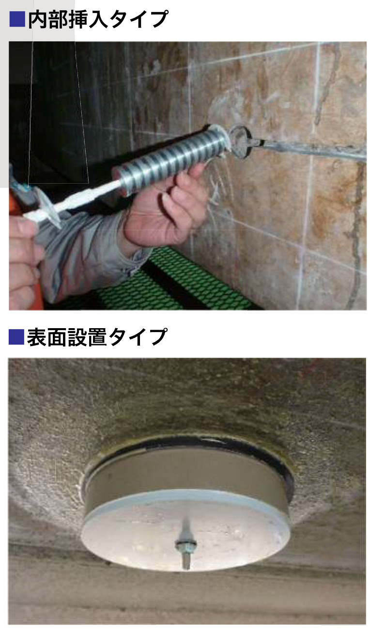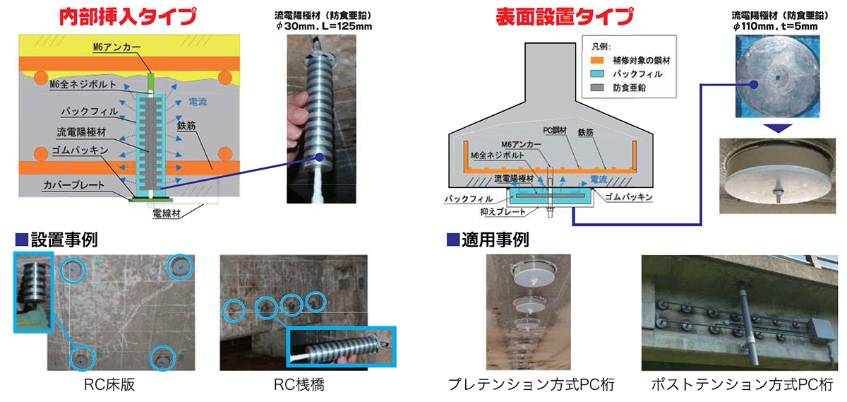日本では外部電源方式が多く採用されていますが、Znカートリッジ工法は外部電源が不要で、機械のメンテナンスも不要となります。施工方法は内部挿入タイプも表面設置タイプも流電陽極材をあと施工アンカーで固定するのみで容易なうえに、取替えも可能です。現在は試験施工が終わって、2020年度から本施工を開始する予定です。
