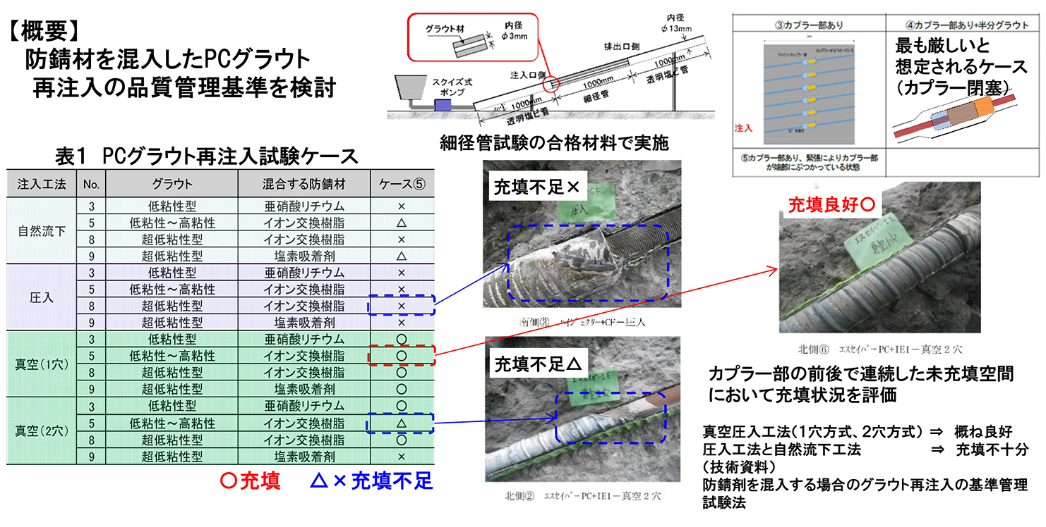 NEXCOの高速道路では、PCグラウトの設計・施工技術が比較的古いPC橋の維持管理において、長期保全対策として予防保全的にPC鋼材のグラウト充填状況を調査し、必要なグラウト再注入を計画的に実施していくこととしています。また、高速道路では凍結防止剤を散布する路線が多いことから、PC鋼材の腐食抑制対策としてグラウト材に防錆剤を混入して再注入を設計・施工する場合があります。そのため、NEXCOの施工管理方法として防錆材を混入した場合にも適切に評価できる試験法の案を提案しています。(概要は下図参照)