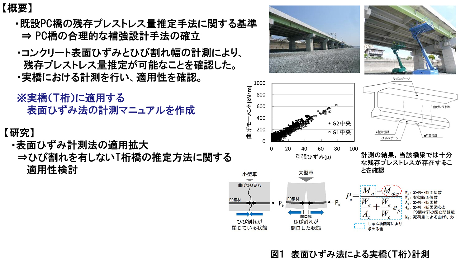 長谷 これまでの研究ではコア応力解放法がある程度精度よく使えるということを確認しました。また、表面ひずみ法については、東京理科大学(加藤佳孝教授)、飛島建設㈱、東電設計㈱との共同研究を引き続き進めています。表面のひずみとひび割れの開閉を計測することで、プレストレス量を推定する方法です。(概要は下図参照)