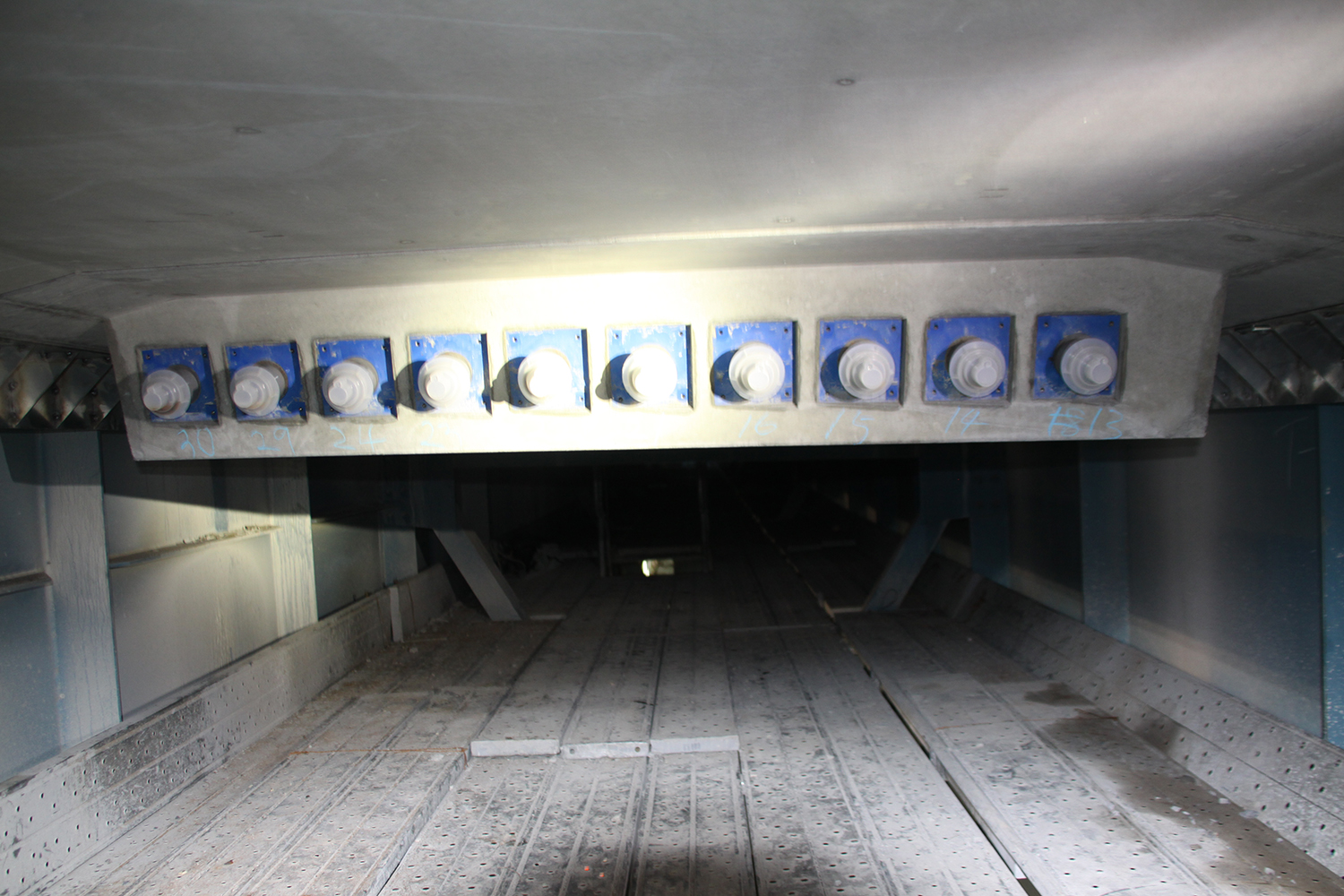 縦締めによるプレキャスト床版の継手施工。間詰部が極小化される(井手迫瑞樹撮影)