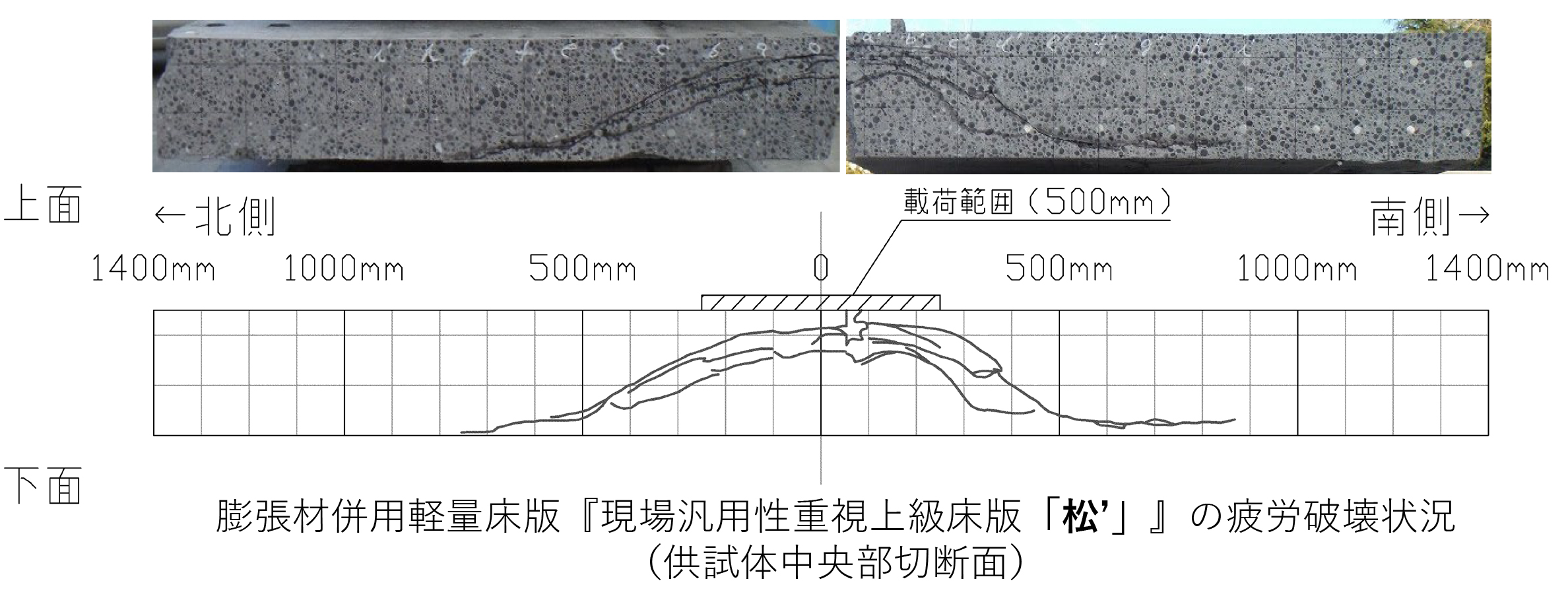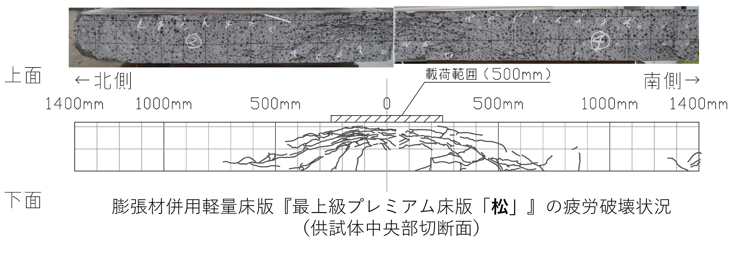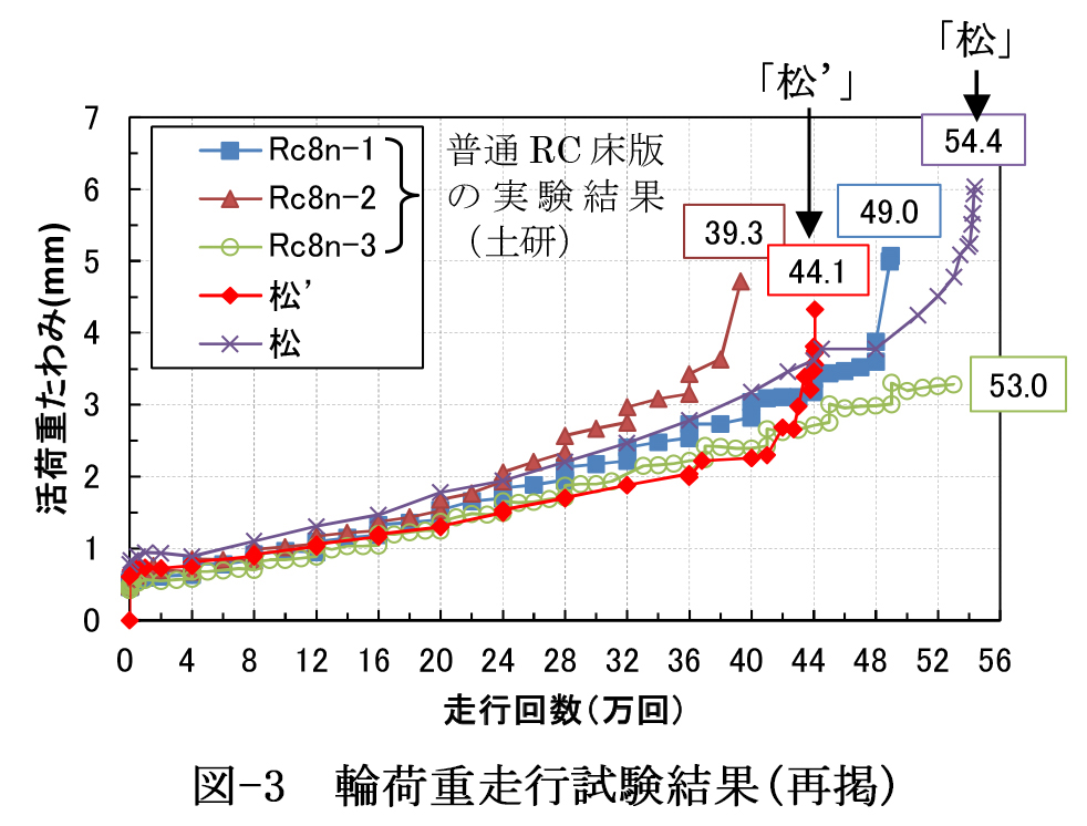 ちなみに、先ほど話したCARTにおいて松’のもう一つの研究目的が、この膨張圧対策に関するものです。すなわち現場施工を考えると従来通り縦筋を配置しない方がいいのですが、床版厚さ方向の膨張圧をコントロールする必要があります。そこで、膨張特性試験等を行い、3方向の膨張圧を計測し、厚さ方向に過大な膨張圧が入ることなく、床版水平2方向には適度なケミカルプレストレスが入る膨張材の混和量を見つけたわけです。これが先ほど説明した低添加タイプで今までひび割れ防止程度の標準混和量といわれた20kg/m3です。耐久性に関しても輪荷重走行試験を行い北線で施工した床版と同等程度の耐久性があることを確認しています。これにより現場汎用性上級床版の松’は縦筋を配置することなく施工できることとなりました。