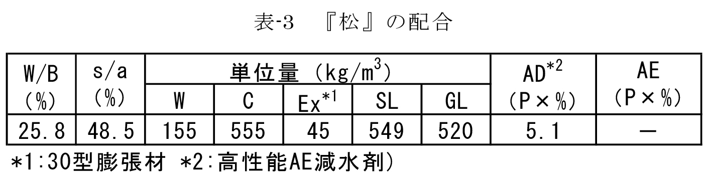岸 積極的にケミカルプレストレスを導入するため、標準混和量の1.5倍の30~45kg/m3使いにしたのが松のコンセプトです。ここまで膨張力を高めると、鉄筋が適切に配置されていなければ膨張材の膨張力がコンクリートを内部から破壊する方向のモードになるためしっかりと拘束する必要が出てきます。