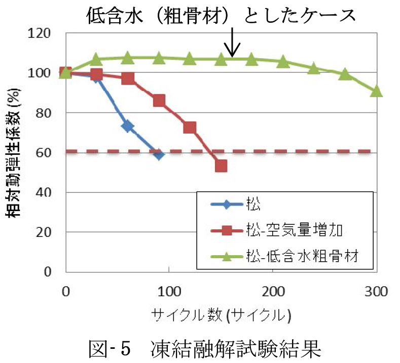 そこまで水比を下げるとコンクリートが自己乾燥するので、細骨材にプレウエッティング(事前吸水)された標準品を使用しても耐凍害性が確保できます。