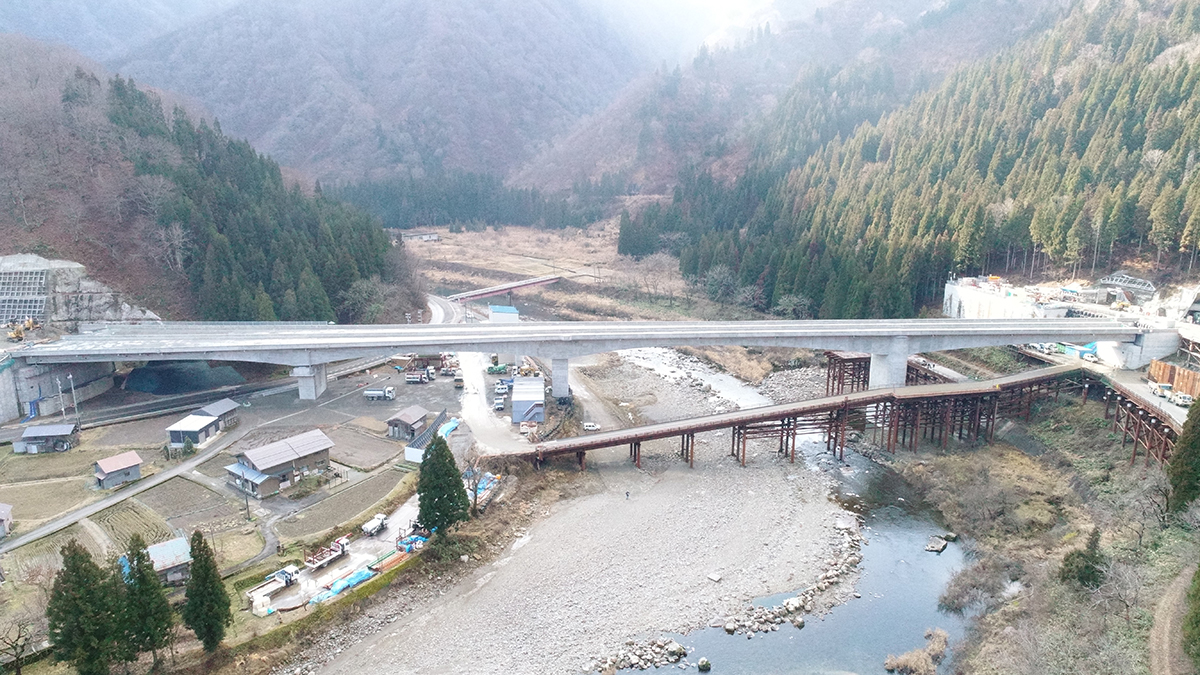 さらに、国道158号大野油坂道路・九頭竜川橋では、BIM/CIMモデルとICT技術を連携させデジタルツインを活用することで生産性向上と品質管理の高度化に取り組みました。具体的には、①建設機械の4Dシステムによる取り組み、②UAV撮影写真による配筋検査、③MR技術による型枠・出来形検査の3項目について実施しました。