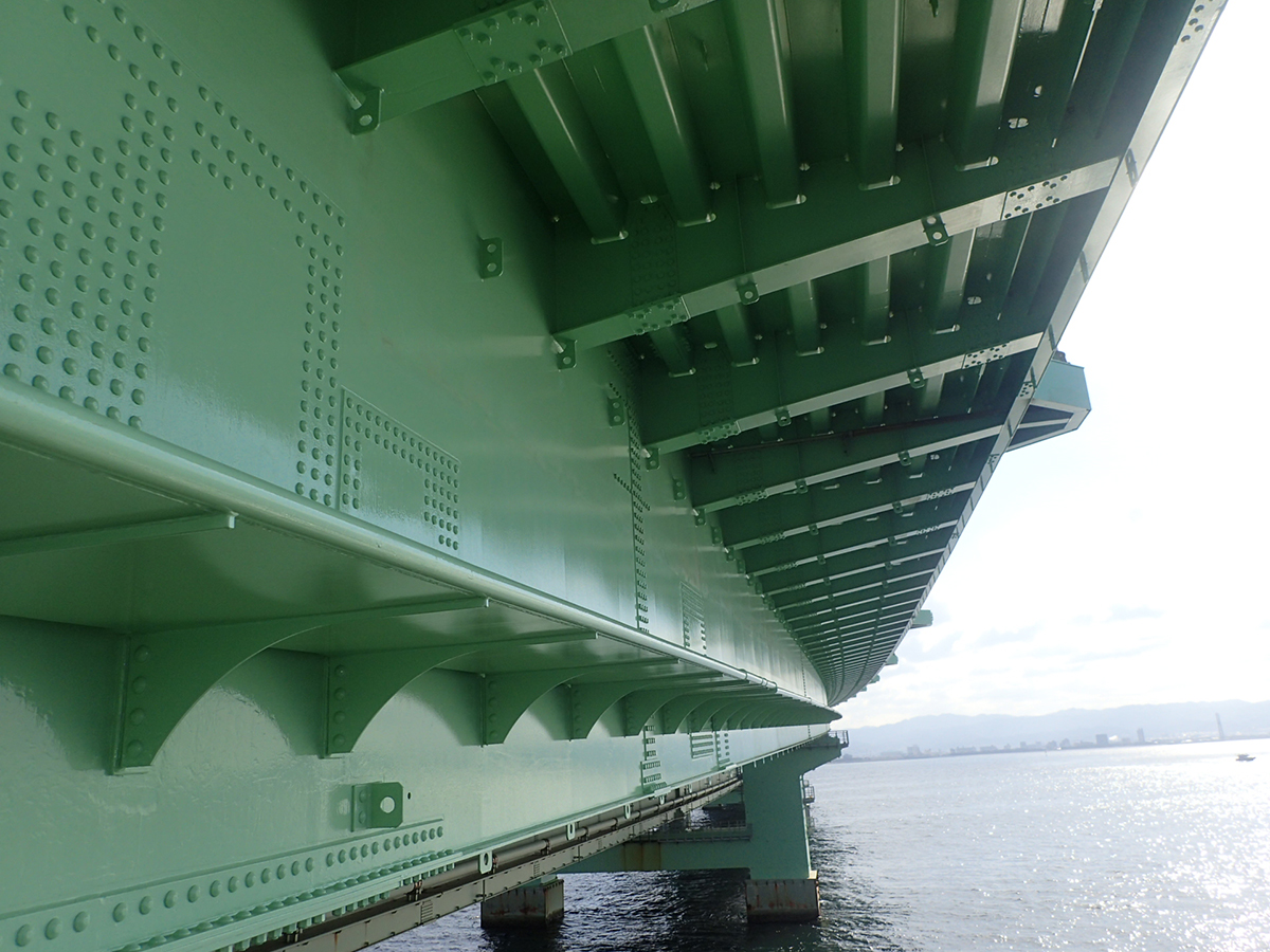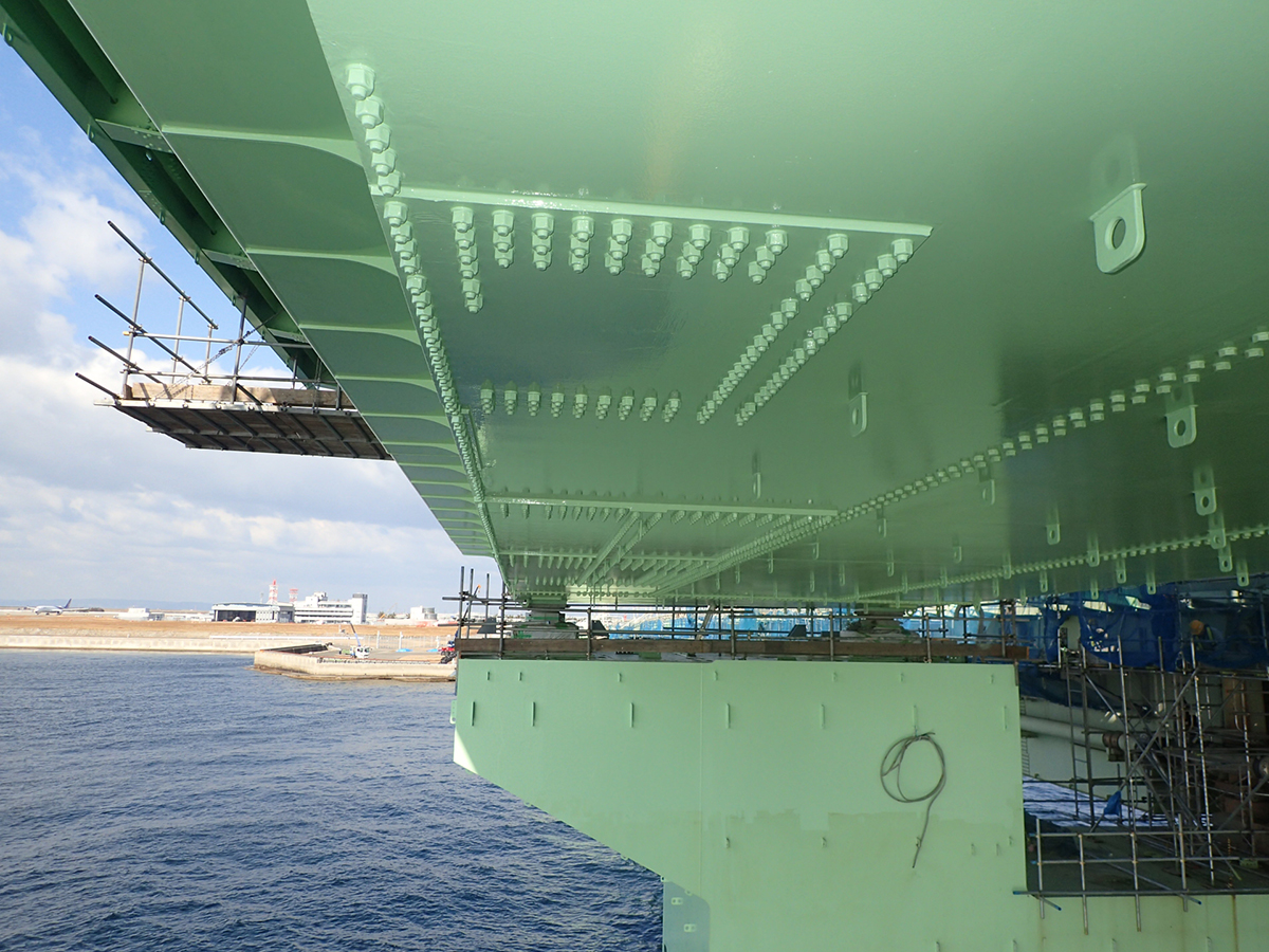 森内 一昨年になりますが、IISが施工した関空連絡橋の復旧工事の一部を担当しました。架替えを行った桁に隣接するりんくうタウン側の桁復旧工事です。タンカーの衝突部分の損傷とともに、めがねタイプの落橋防止装置が破損し、その結果、桁端部もかなり変形していました。IISと協力体制を築き、損傷部を矯正して当て板補強を行うなどの対策を、架替え桁の架設までの約4か月の短期間で完了しました。