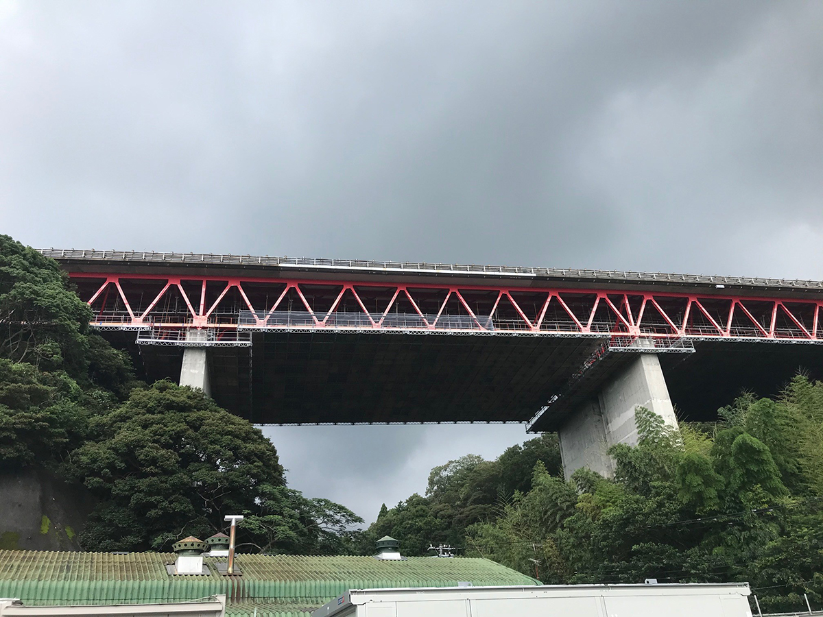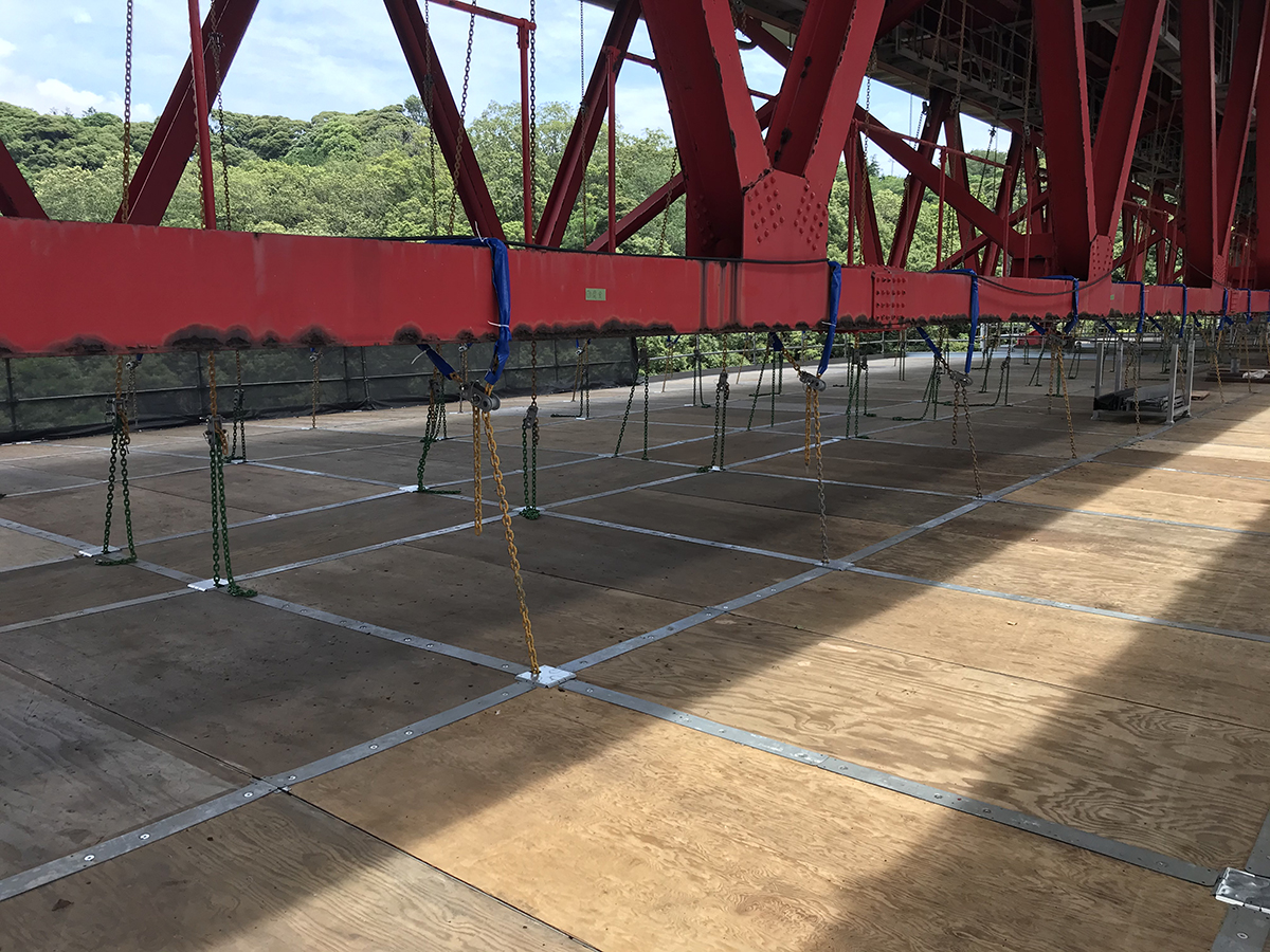 現在は、NEXCO中日本発注の東名高速道路・向田川橋他1橋鋼橋補強工事と、同発注の中央自動車道・深沢橋床版取替工事を受注しています。向田川橋他1橋鋼橋補強工事では、工事対象の一つである根古屋橋(橋長240m、鋼トラス橋)で足場設置が終わったところです。深沢橋(橋長149m、鋼トラス橋)は、設計中で施工は2021年秋からの予定です。