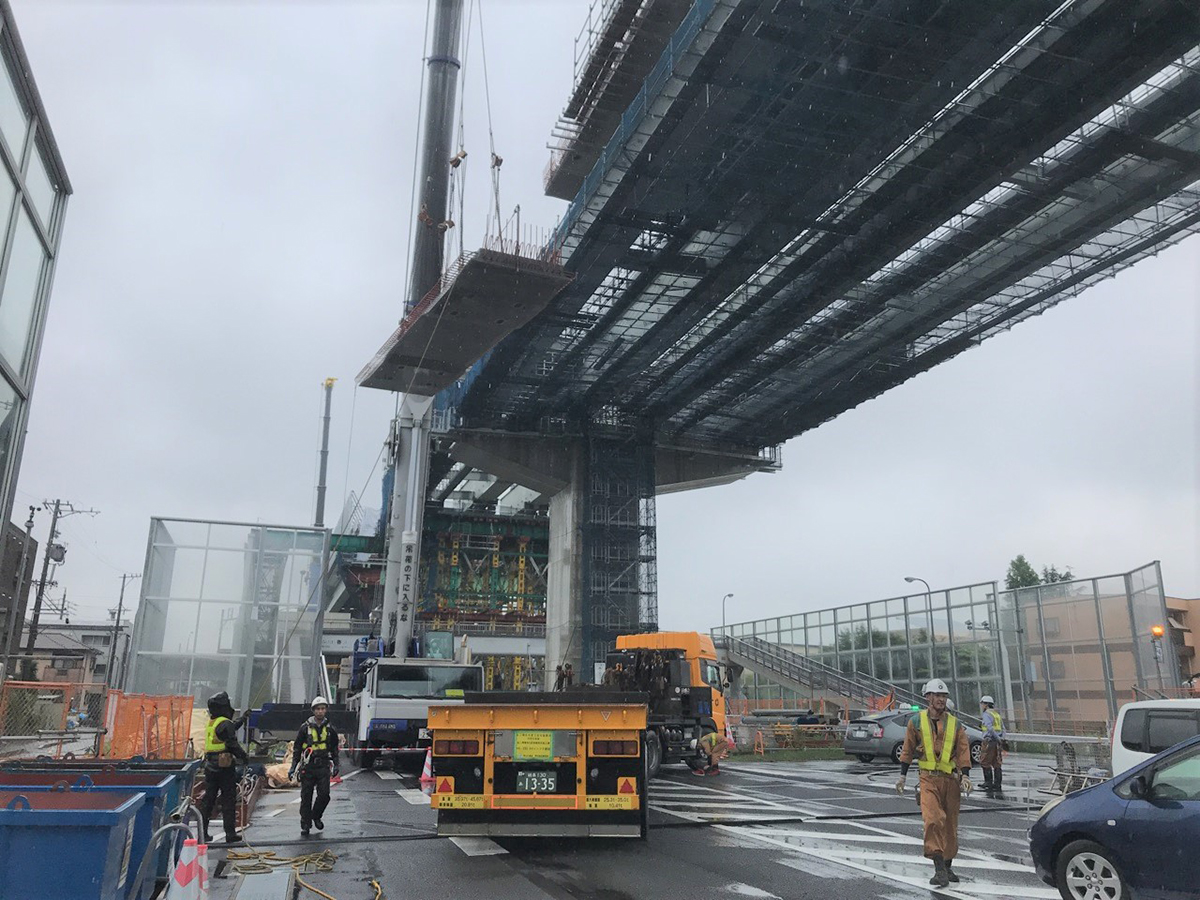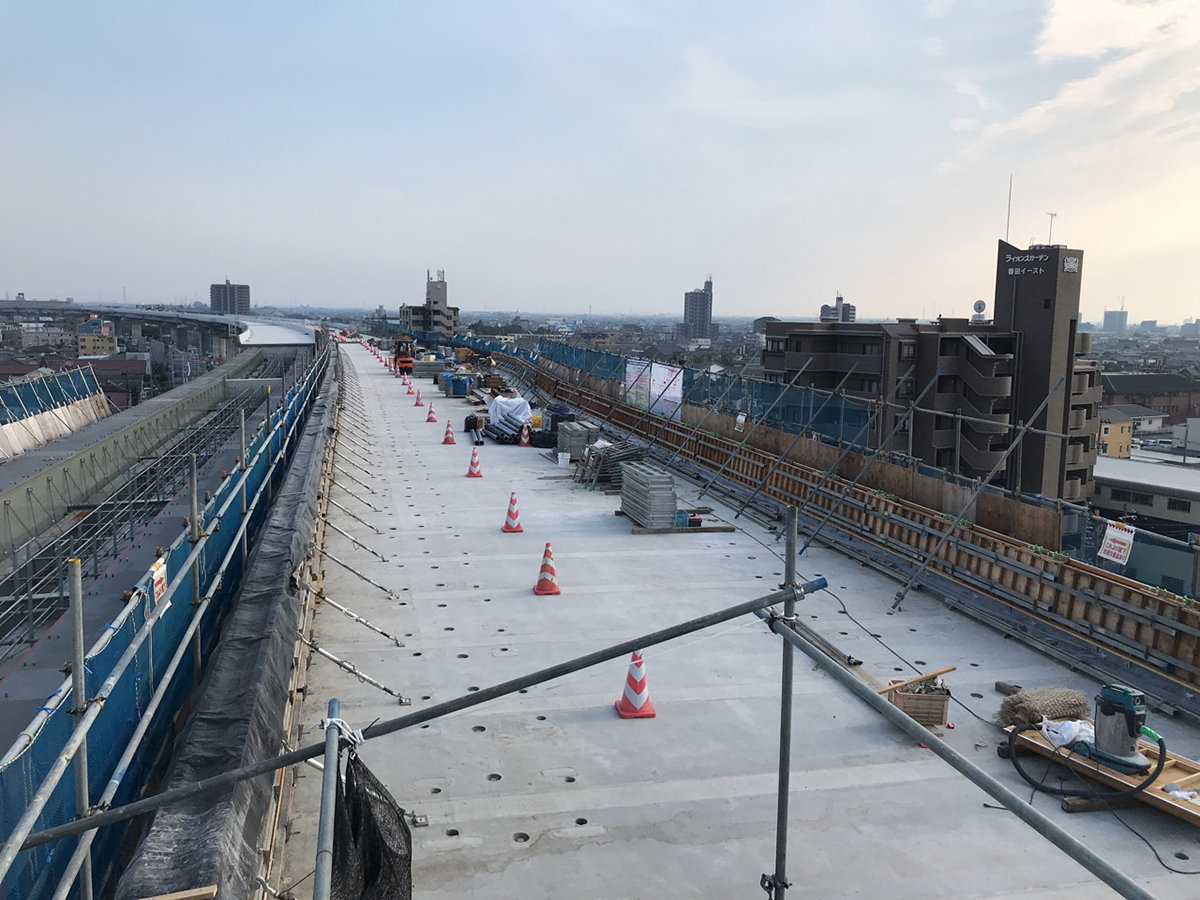 森内 今年度開通予定の名古屋環状2号線・名古屋西JCT~飛島JCT(仮称)間にある春田3高架橋(橋長191m、鋼3径間連続細幅箱桁)の床版工事などを施工しています。本工事は、中部地方整備局発注で、工期は10月20日までですので、まもなく完成です。