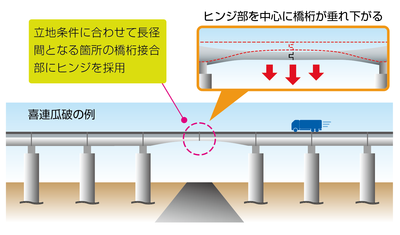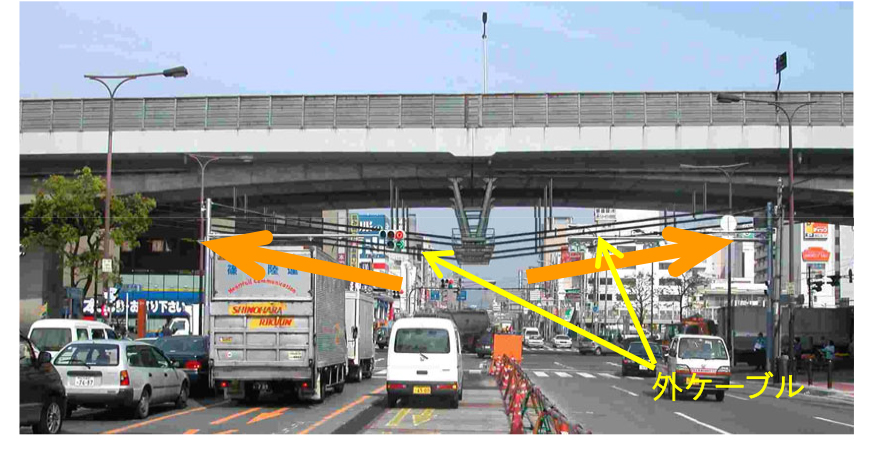喜連瓜破高架橋のヒンジ部の垂れ下がり(上)と外ケーブル及びサドルによる補強