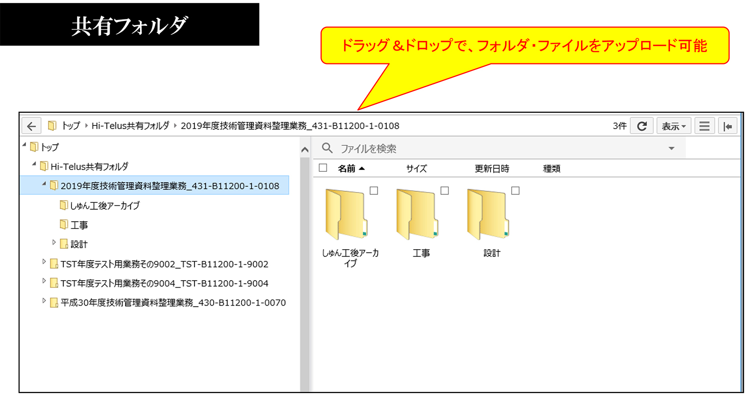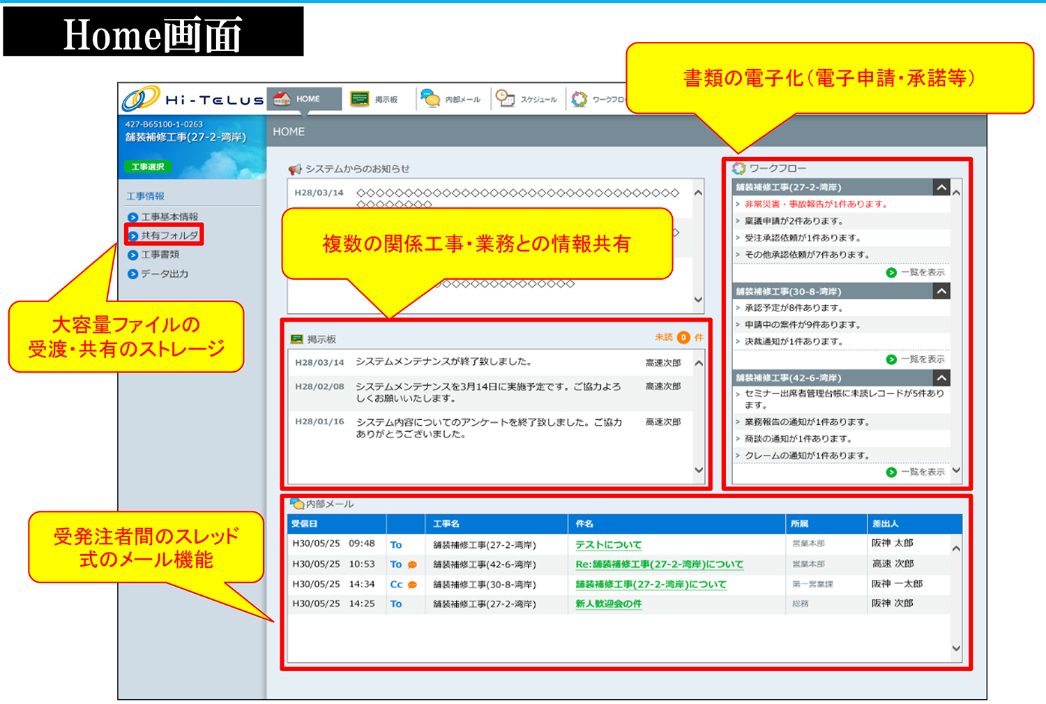 Hi-TeLusのホーム画面/工程の共同管理/共有フォルダ