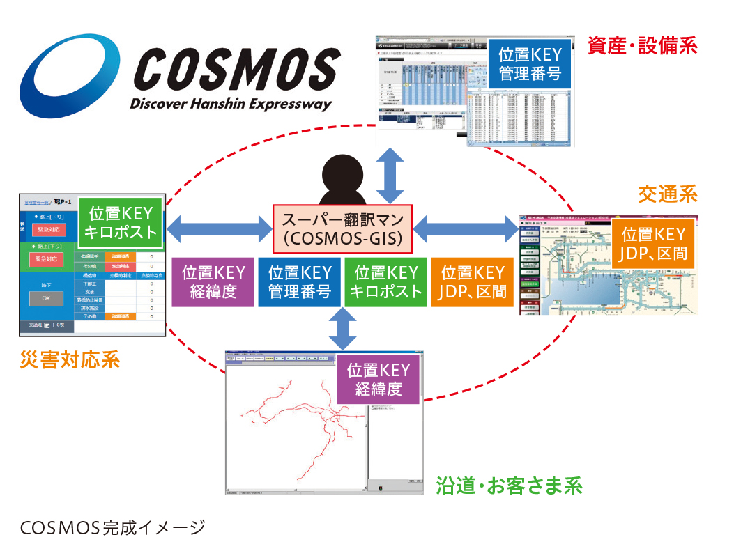 吉田 COSMOSは、阪神高速道路に関連する複数の管理事業情報を集約・統合し、地図上での可視化・重ね合わせを可能にするGISプラットフォームです。本システムは世界測地系の緯度経度の他、構造物の管理番号、キロポスト等といった位置情報に関する互換性を持っていることから、様々なデータの地図上での重ね合わせ表示が可能となっています。