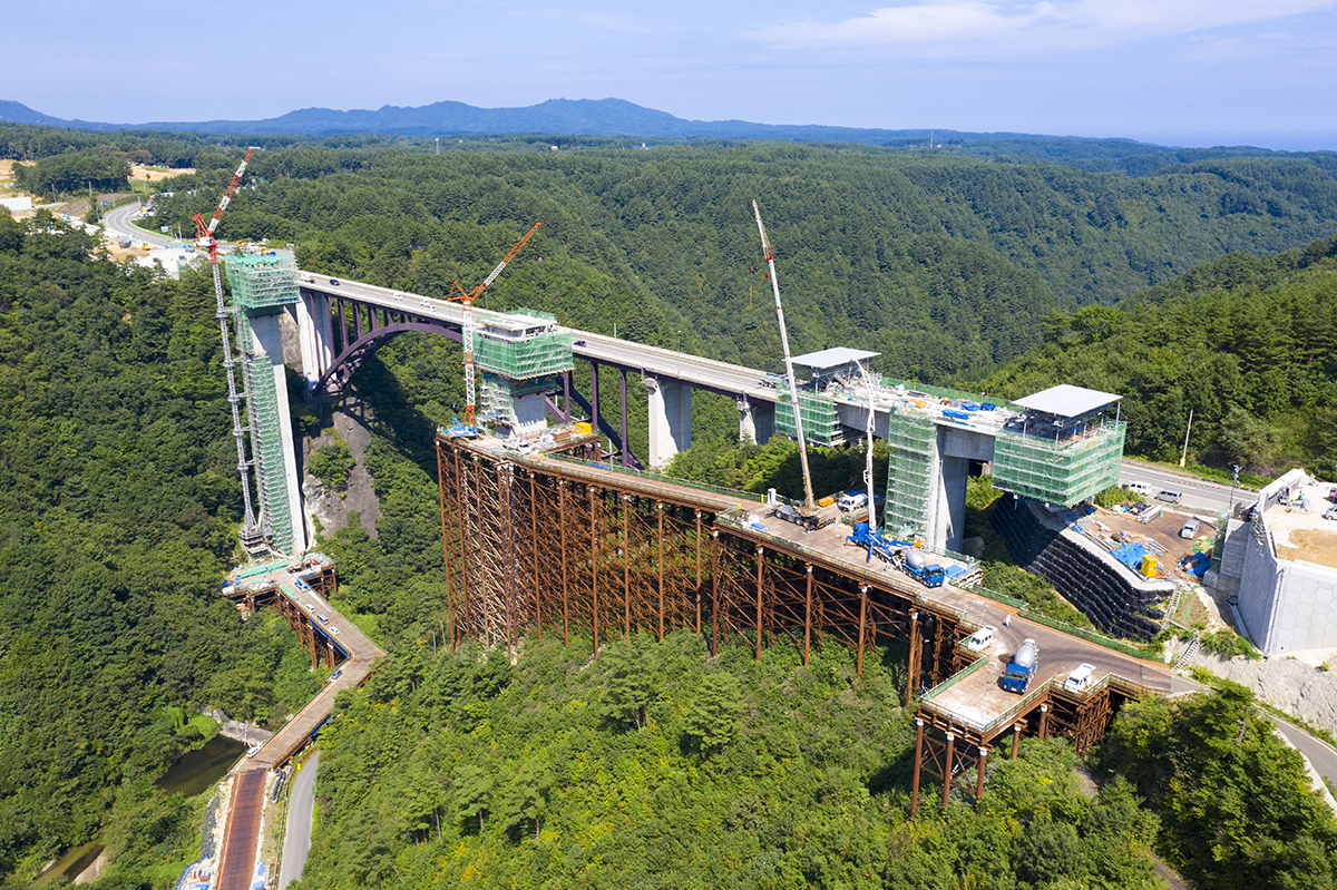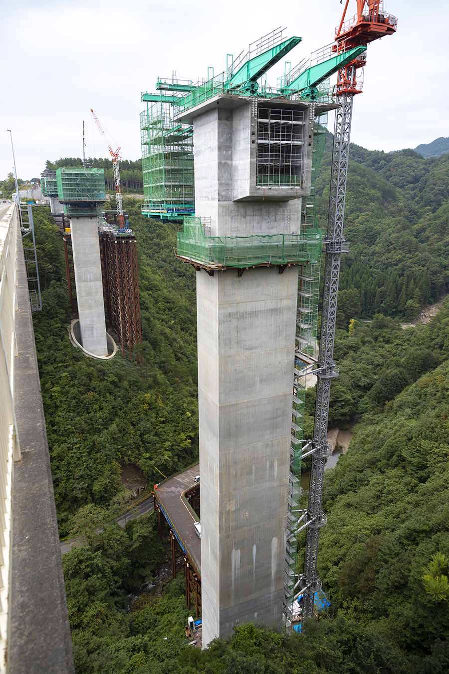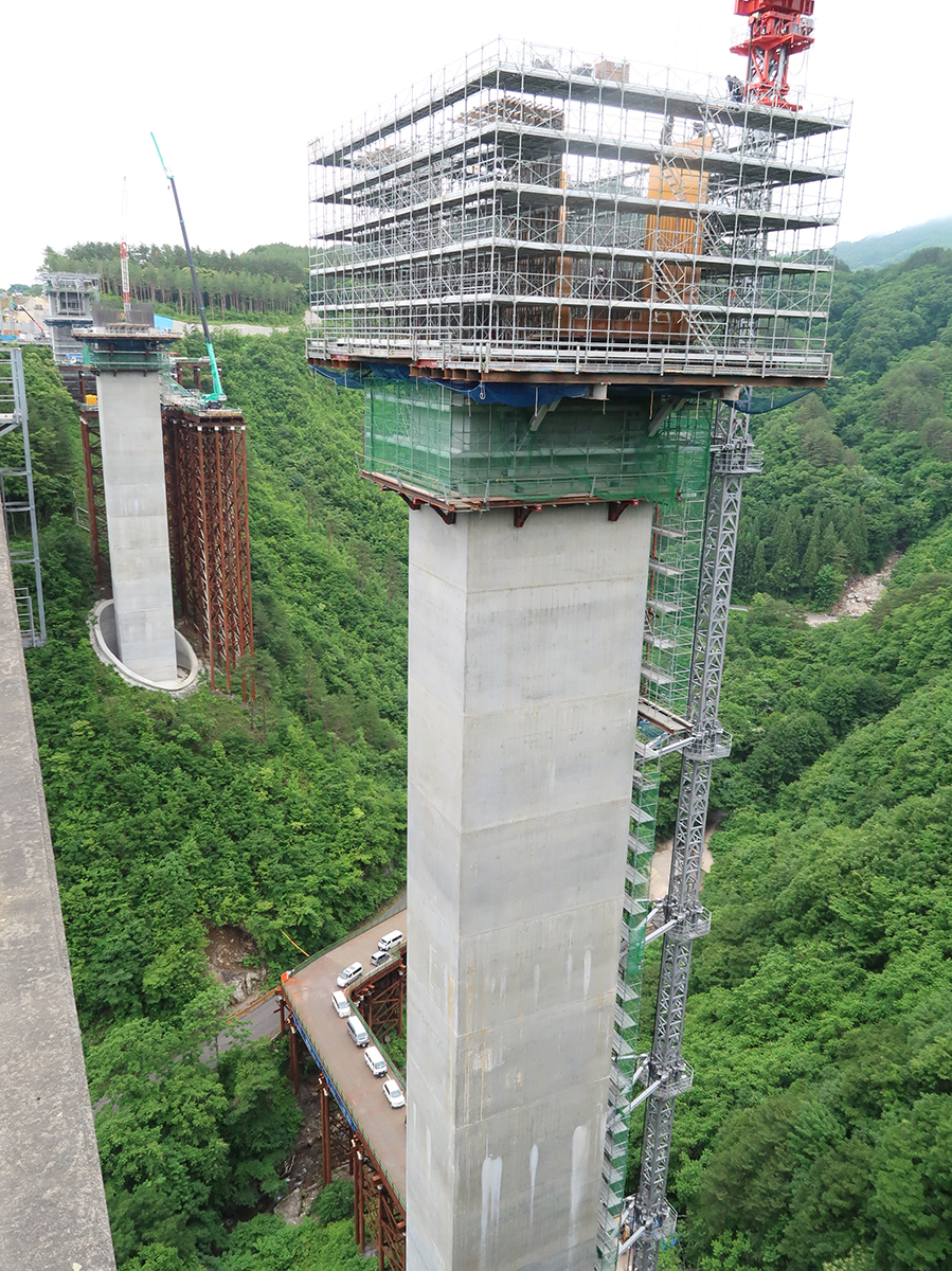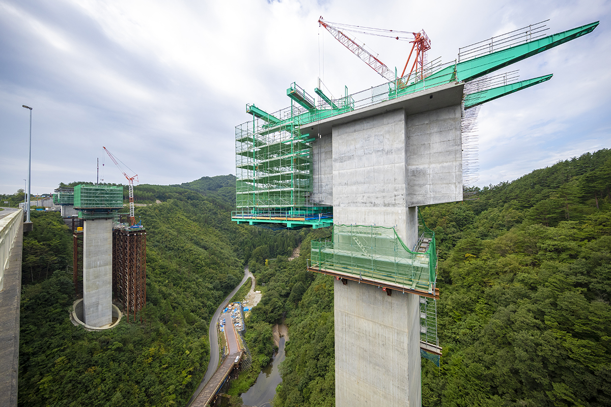 髙松 田野畑道路の新思惟大橋が挙げられます。橋長394m、幅員12mのPC4径間連続ラーメン箱桁橋で、村道鉄山線と松前川を跨ぐ急峻な谷地形に架橋しています。松前川の川床から路面高までは約130mで、P3橋脚高は93mと国内最大級になっています。支間長もP2-P3間が150mで国内最大級を誇っています。現在、下部工施工が完了して、上部工の張出架設を進めています。