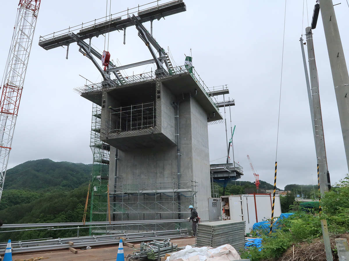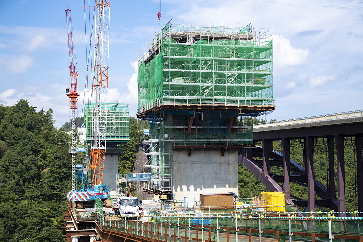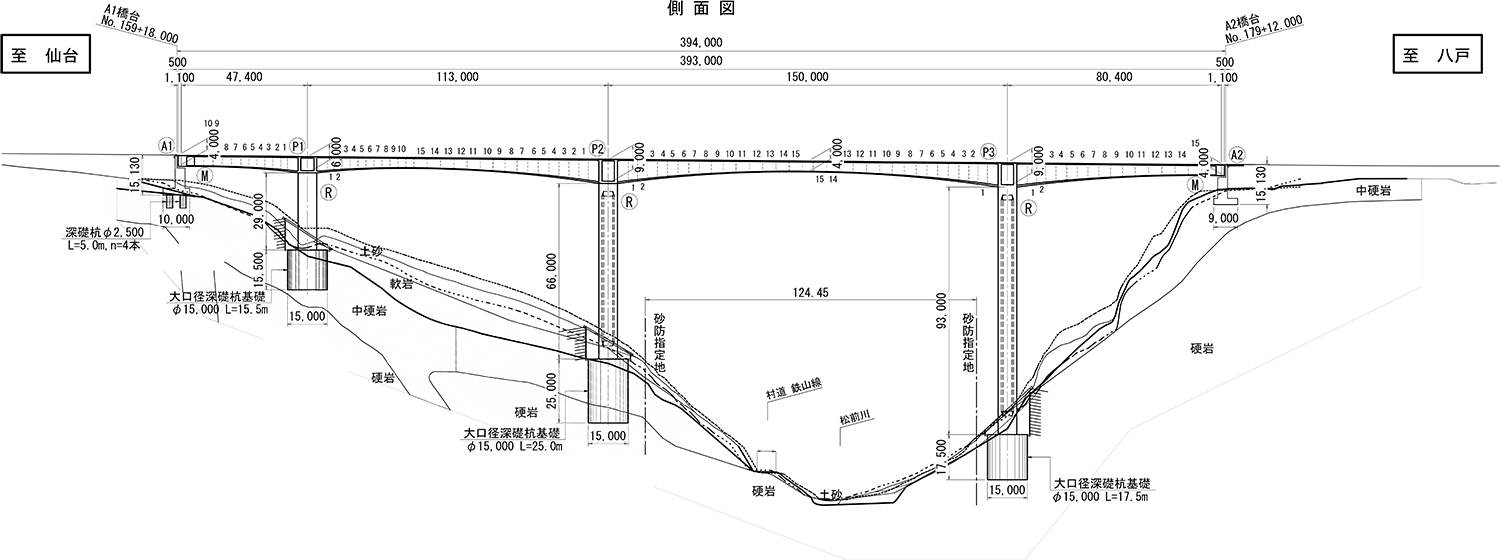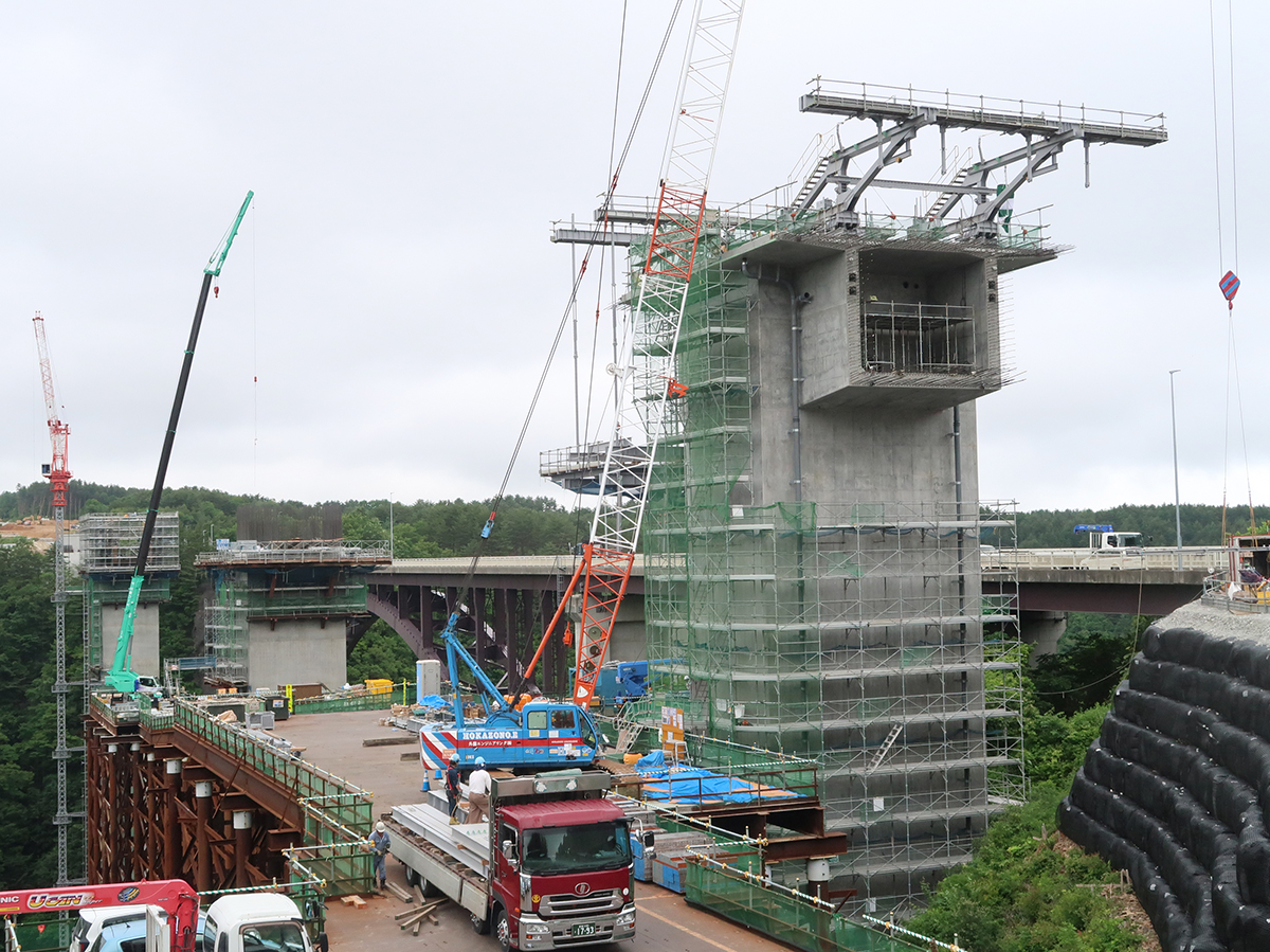 髙松 田野畑道路の新思惟大橋が挙げられます。橋長394m、幅員12mのPC4径間連続ラーメン箱桁橋で、村道鉄山線と松前川を跨ぐ急峻な谷地形に架橋しています。松前川の川床から路面高までは約130mで、P3橋脚高は93mと国内最大級になっています。支間長もP2-P3間が150mで国内最大級を誇っています。現在、下部工施工が完了して、上部工の張出架設を進めています。