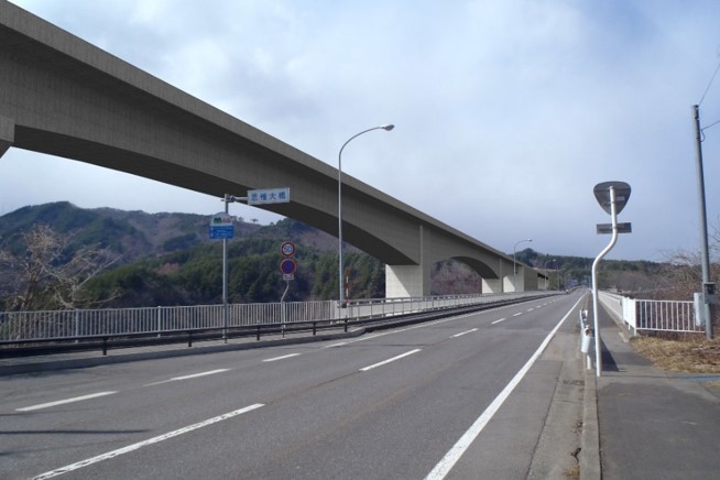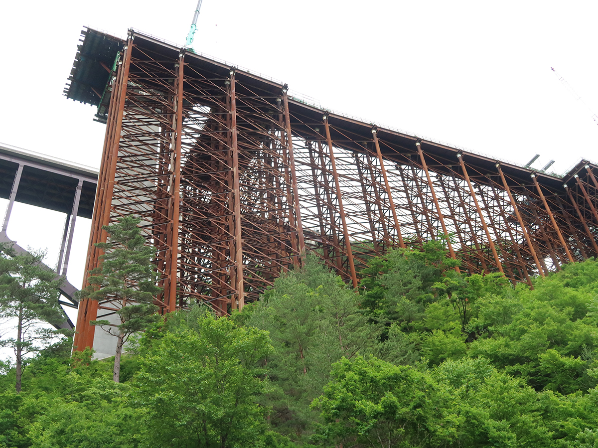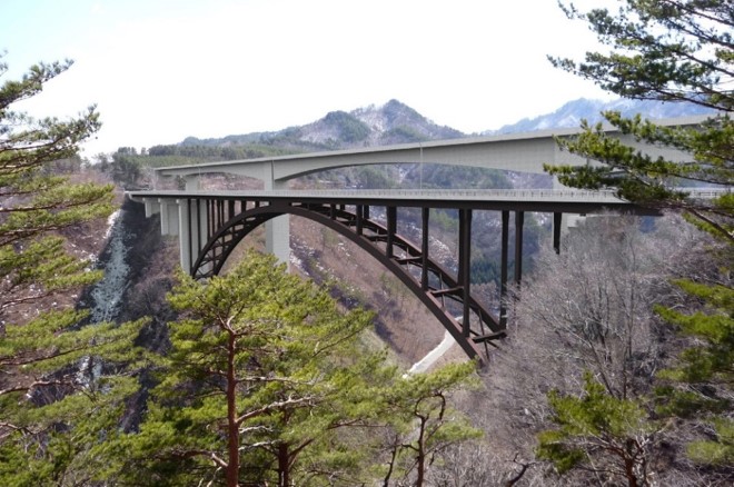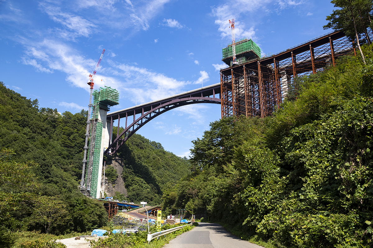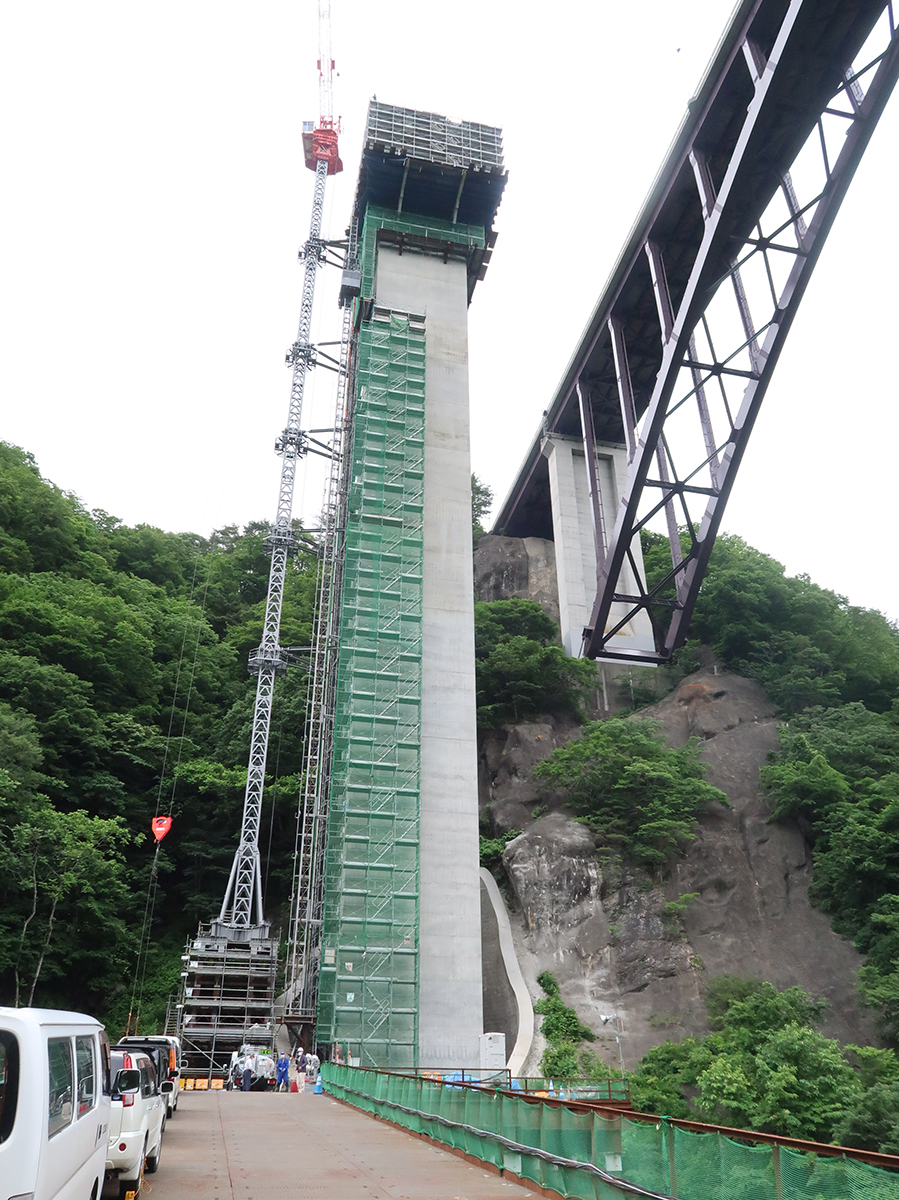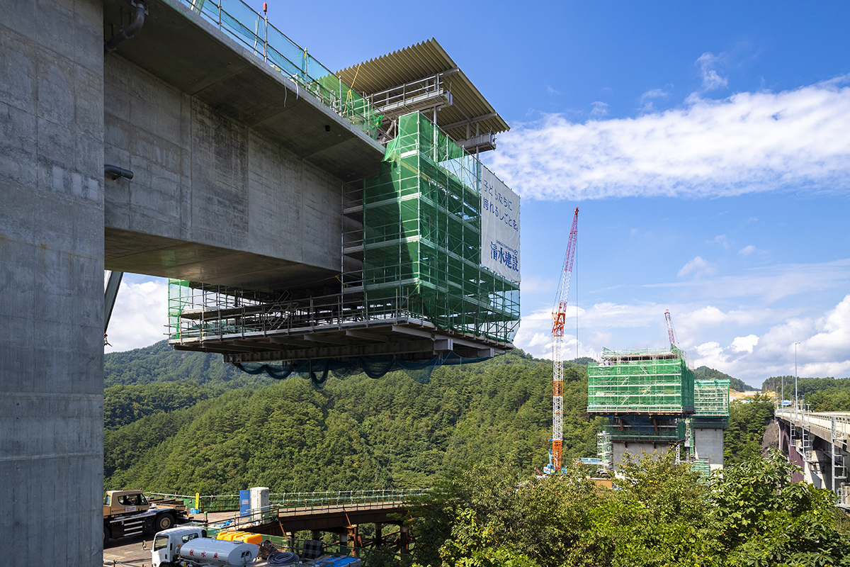 髙松 田野畑道路の新思惟大橋が挙げられます。橋長394m、幅員12mのPC4径間連続ラーメン箱桁橋で、村道鉄山線と松前川を跨ぐ急峻な谷地形に架橋しています。松前川の川床から路面高までは約130mで、P3橋脚高は93mと国内最大級になっています。支間長もP2-P3間が150mで国内最大級を誇っています。現在、下部工施工が完了して、上部工の張出架設を進めています。