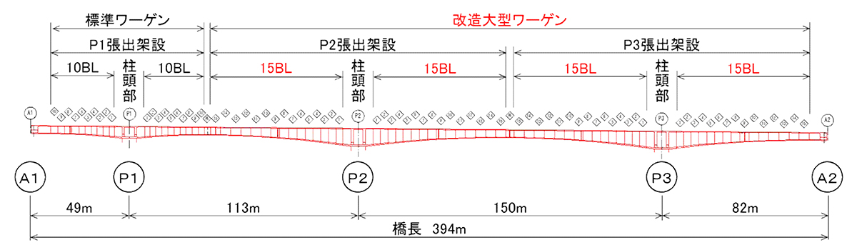 髙松 張出架設はP1橋脚から架設を開始して、P3橋脚、P2橋脚の順に始める予定です。施工長が短いP1橋脚からは200t/mの標準ワーゲンを用いて、1ブロック2.5~3.5mを10ブロック架設していきます。支間長が長いP2・P3橋脚からは380t/mの特殊大型ワーゲンで、1ブロック3.5~5mを15ブロック架設します。最大ブロック長5mの施工ができる特殊大型ワーゲンを採用することで、当初計画よりもブロック数を減らして工程短縮を図ります。また、中央閉合はワーゲンの一部を吊り支保工として施工することで、吊り支保工設置の工程を省きます。