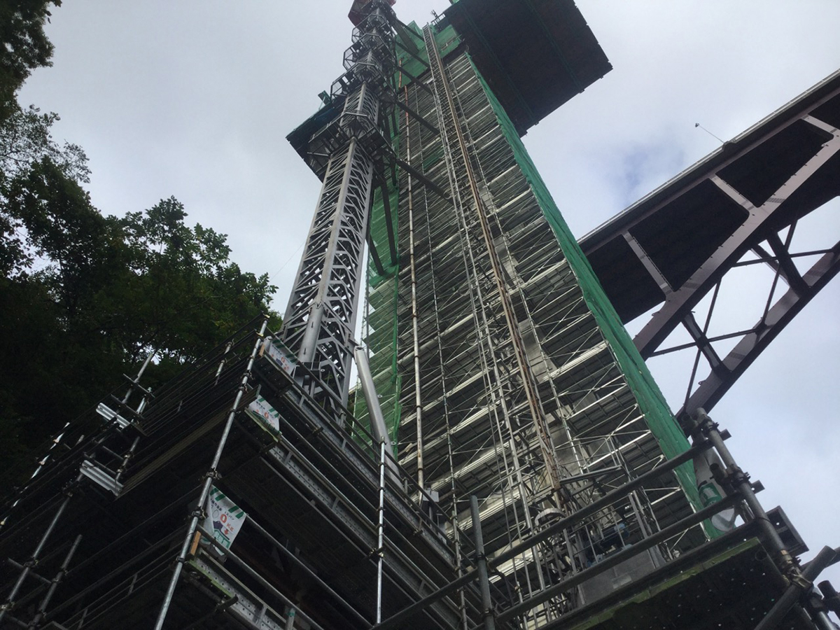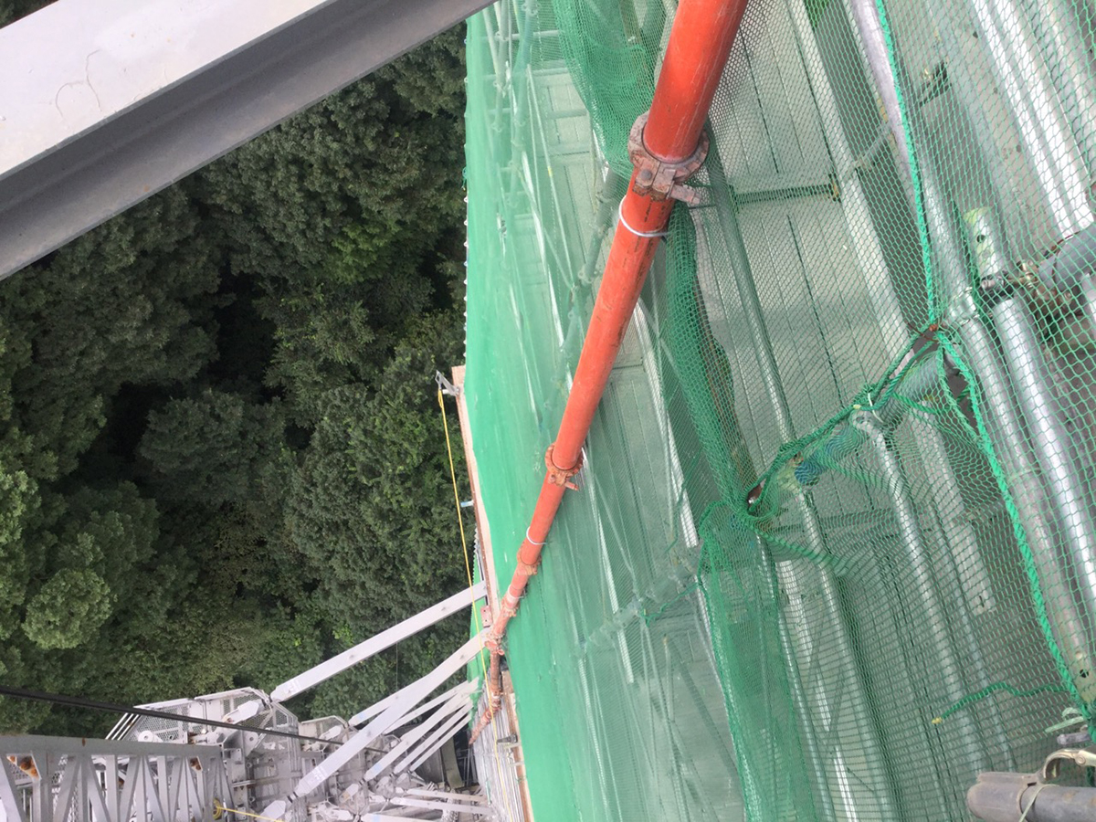 足場は総足場より工程短縮ができる昇降式のブラケット足場を採用しています。