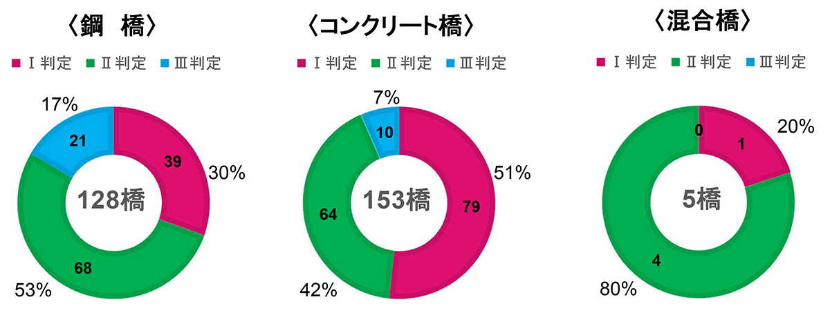 髙松 橋種別では、鋼橋(128橋)のⅠ判定が30%、Ⅱが53%、Ⅲが17%であるのに対して、コンクリート橋ではⅠが51%、Ⅱが42%、Ⅲが7%となっており、鋼橋に比較してコンクリート橋のほうが健全度が高いと言えます。