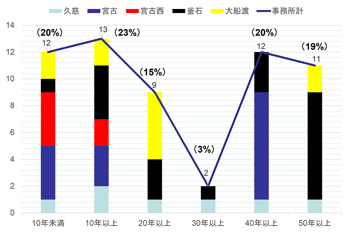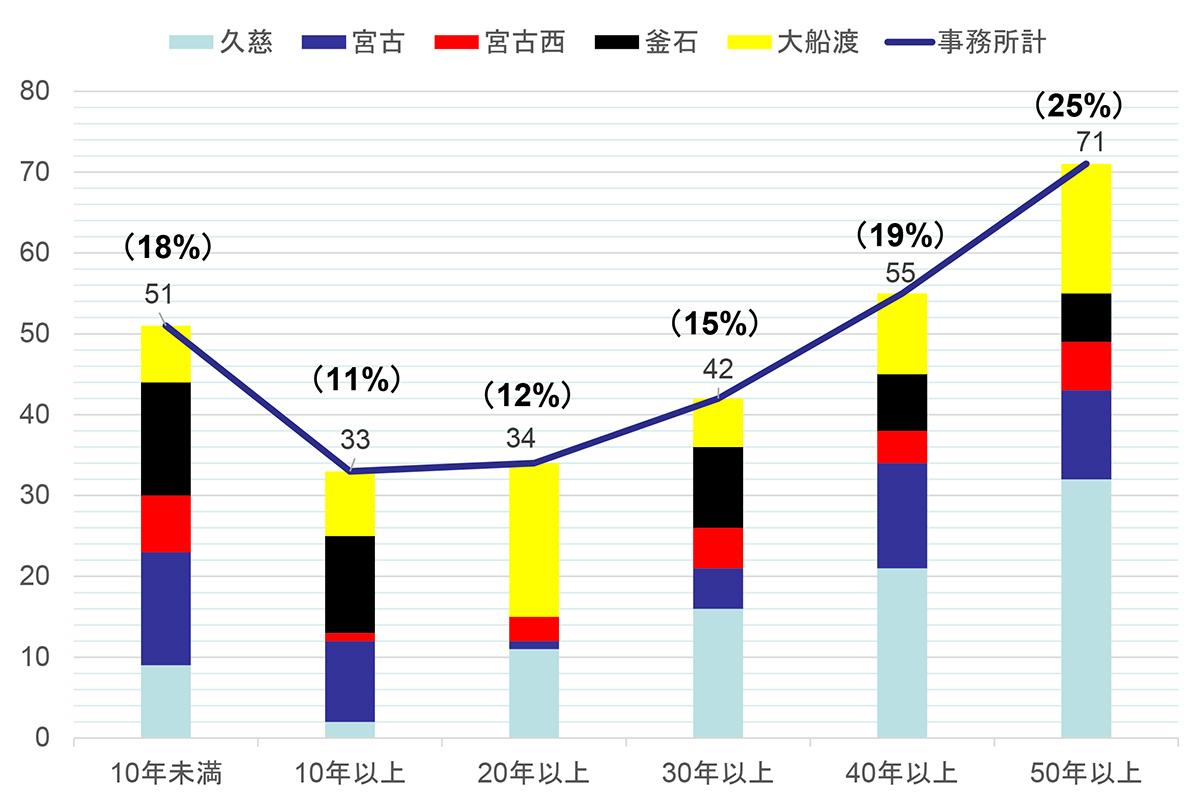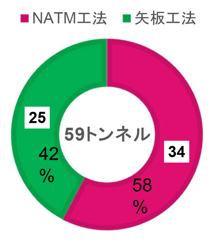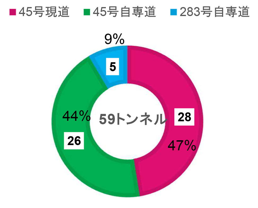 髙松 59本を管理しており、工種別ではNATM工法が58%、矢板工法が42%となります。開通年別では50年以上が11本あり、19%を占めています。大船渡市にある国道45号現道・三陸トンネル(延長476m)が最も古いトンネルで59年経過しています。20年未満は42%です。延長別では、1,000m以上2,000m未満のものが12本(20%)と一番多く、1,000m以上のほとんどが三沿道および東北横断道釜石秋田線のものです。最長は釜石市と住田町にまたがる東北横断道釜石秋田線・新仙人トンネルの4,491.5mです。整備中のトンネルで新仙人トンネルより長いものはありませんが、1,000m以上のものは13本あります(開通済みの宮古西道路を含む)。路線別では、国道45号現道28本、三沿道26本、東北横断道釜石秋田線5本となっています。