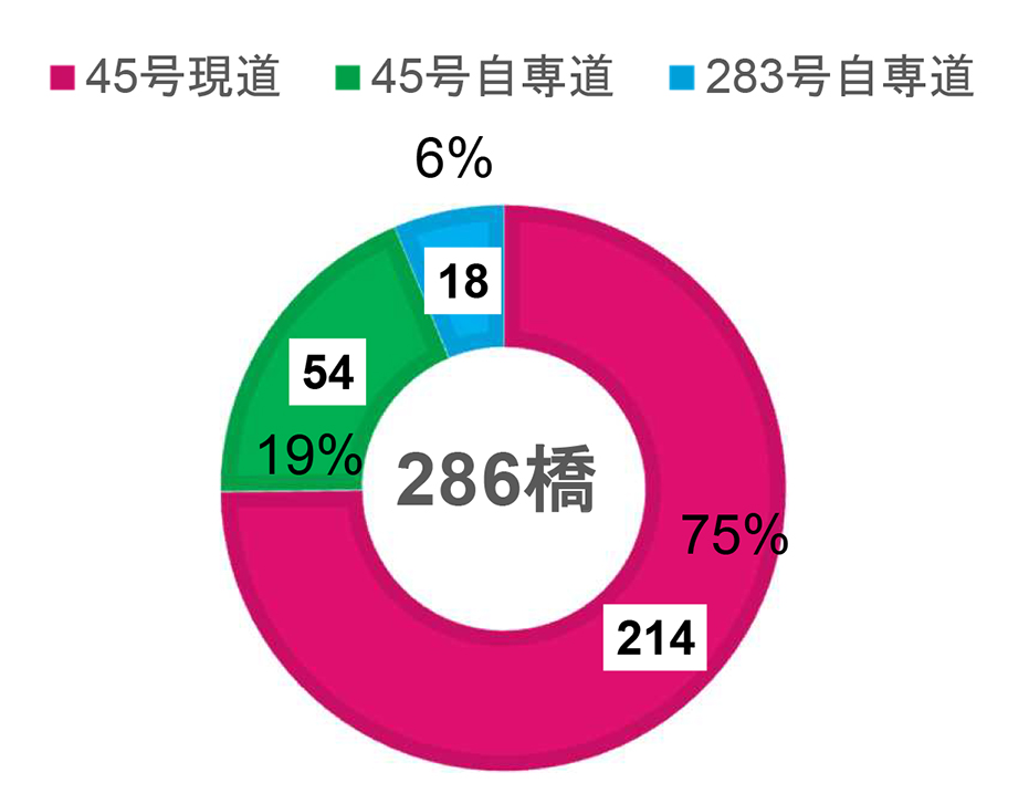 髙松 管理橋梁は286橋です。橋種別ではコンクリート橋が53%、鋼橋が45%、混合橋(*)が2%と若干コンクリート橋が多くなっています。開通年別では50年以上が25%を占め、高齢化が進んでいると言えます。最も古い橋梁は大船渡市にある国道45号現道・浦浜橋(橋長18.9m)で開通後67年が経過しています。20年未満は30%で、三沿道および東北横断道釜石秋田線の整備によるものです。延長別では500m以上が4橋あり、最長は国道45号現道の釜石高架橋の681mとなります。路線別では、国道45号現道が214橋と75%を占めています。