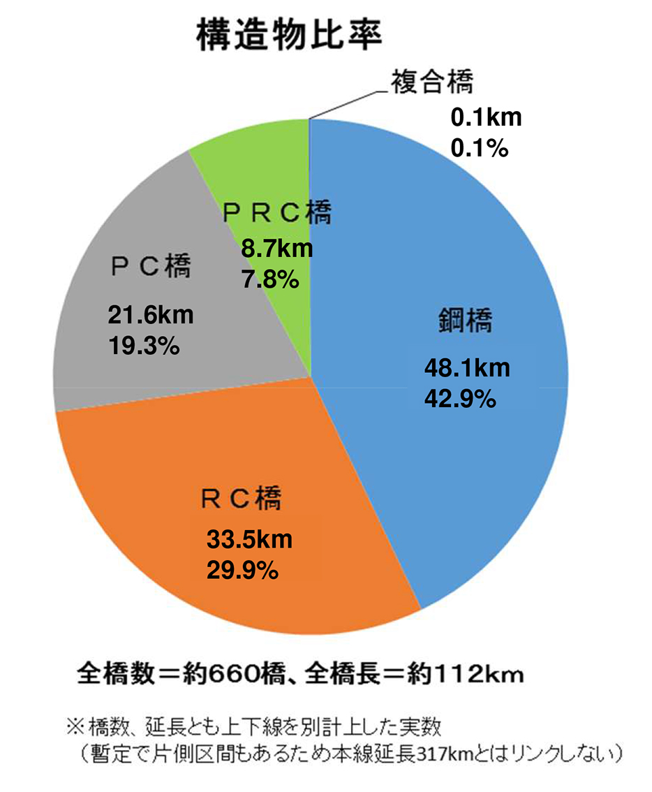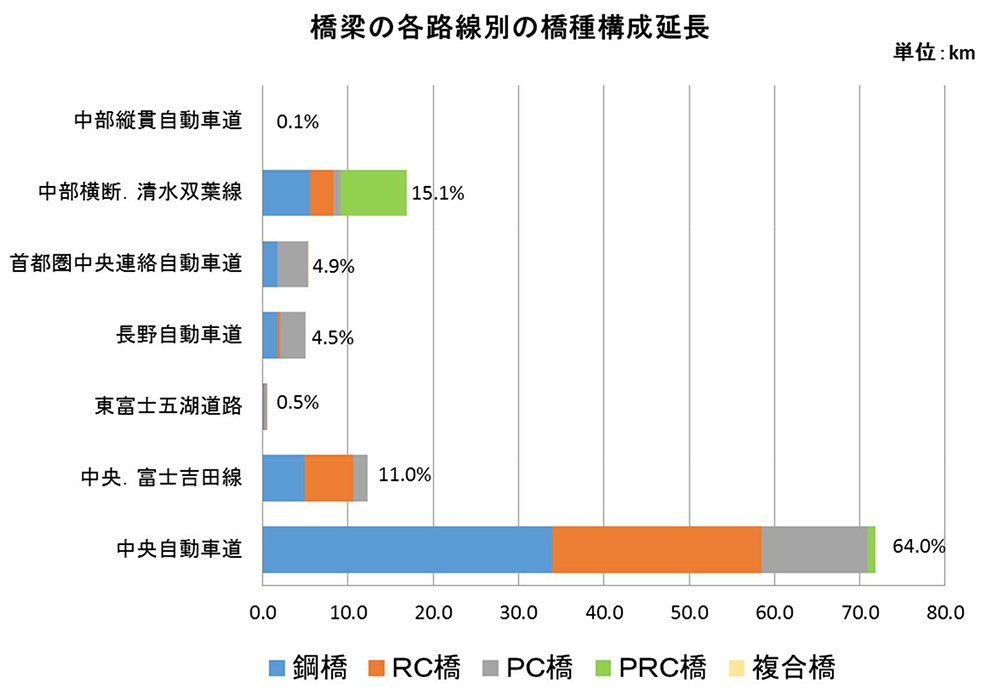 湯川 当支社で管理している橋梁は657橋(延長112.1km)です。橋種別では、鋼橋が約4割と一番多く、RC橋が約3割、PC橋が約2割です。管理橋梁の64%を占める中央道では、地形的要因や建設年代の関係から鋼橋が約48%と半数近く、RC橋が約34%で、PC橋、PRC橋は少なくなっています。