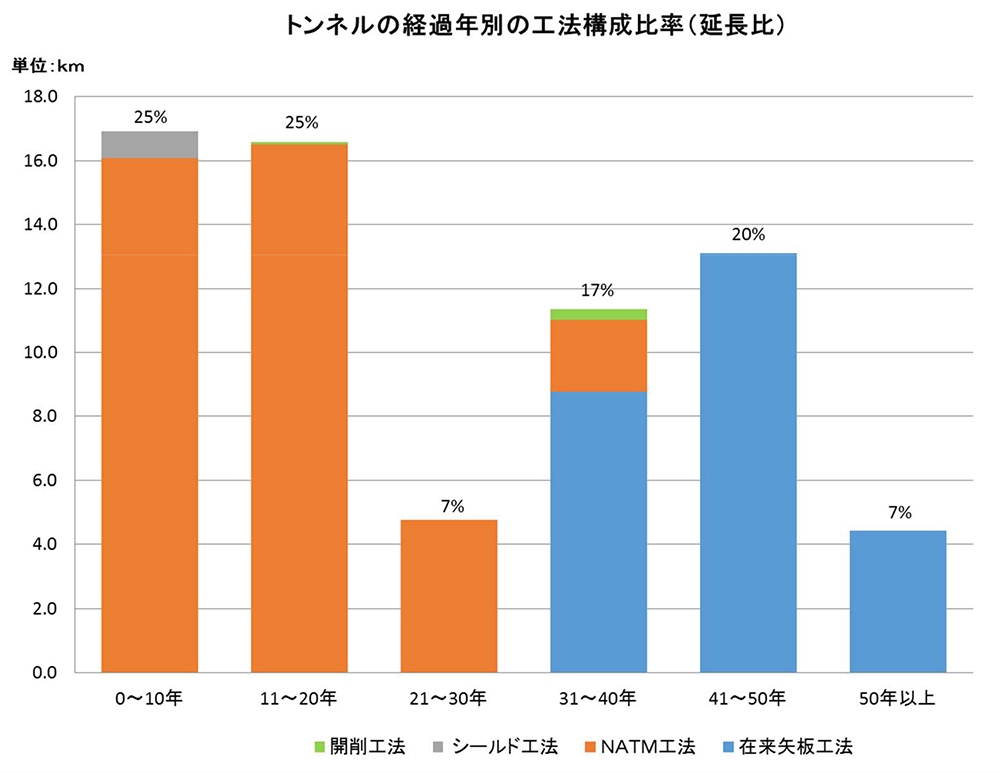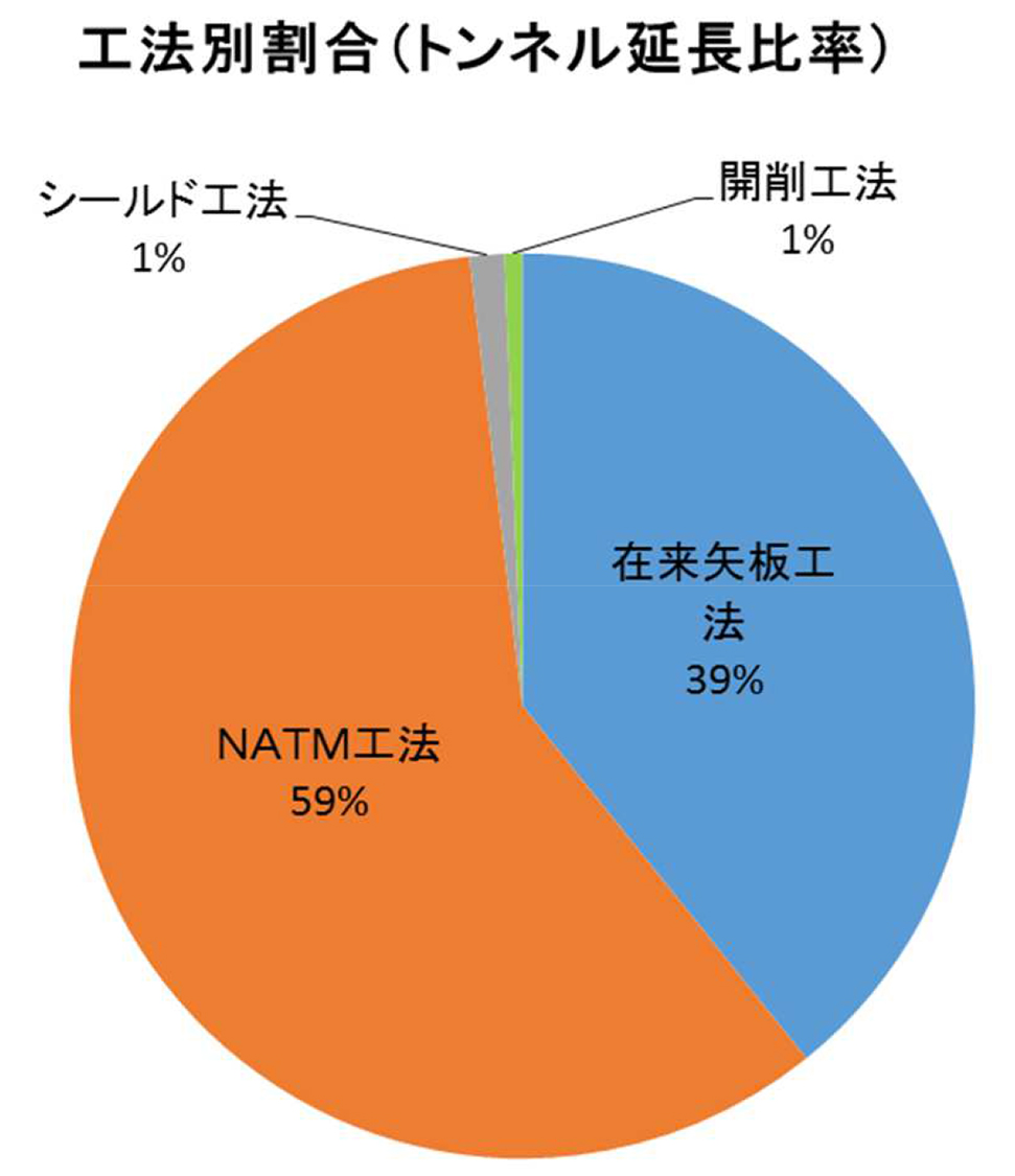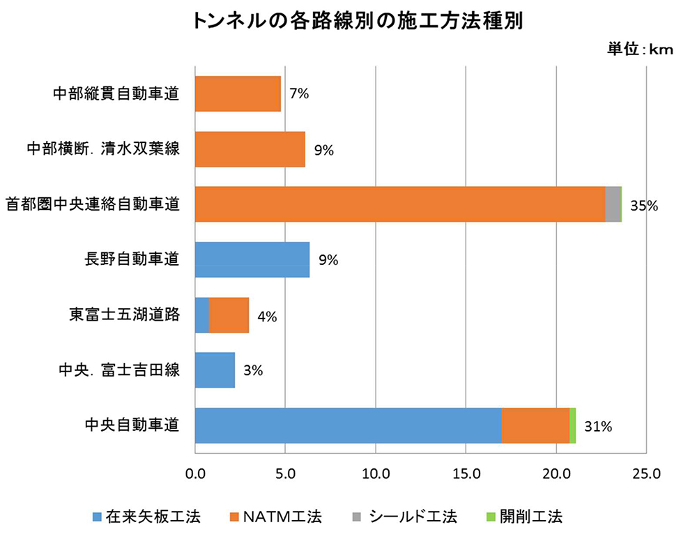 湯川 64チューブ(延長67.2km)を管理しており、工法別(延長比、以下同)では在来矢板工法が約39%、NATM工法が約59%、その他(シールド工法、開削工法)が約2%です。旧JHでは1983年にNATM工法を標準化工法として採用しましたので、30年以下はほとんどNATM工法となっています。路線別のトンネル延長比では、圏央道が約35%を占め、次いで中央道が約31%です。