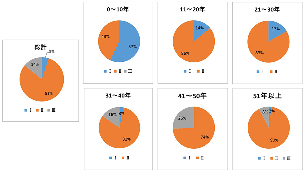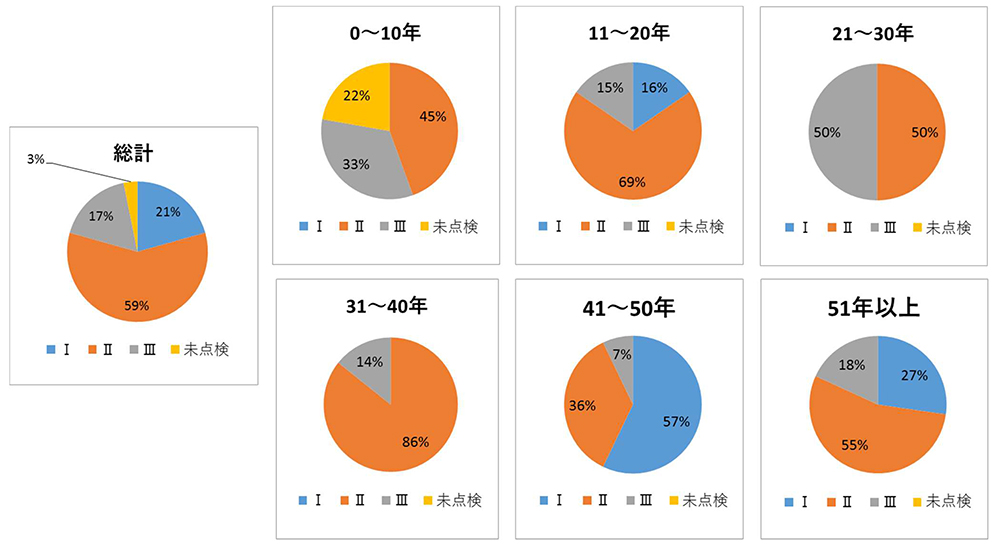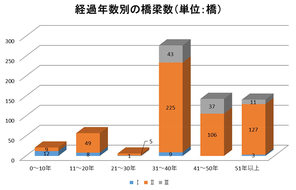 湯川 2019年度末時点での橋梁の健全性診断結果では、診断区分Ⅱが81%と一番多くなっており、Ⅰが5%、Ⅲが14%です。Ⅲは供用後31年以上経過する中央道や長野道などの路線に集中しています。トンネルでは、診断区分Ⅰが21%、Ⅱが59%、Ⅲが17%です。