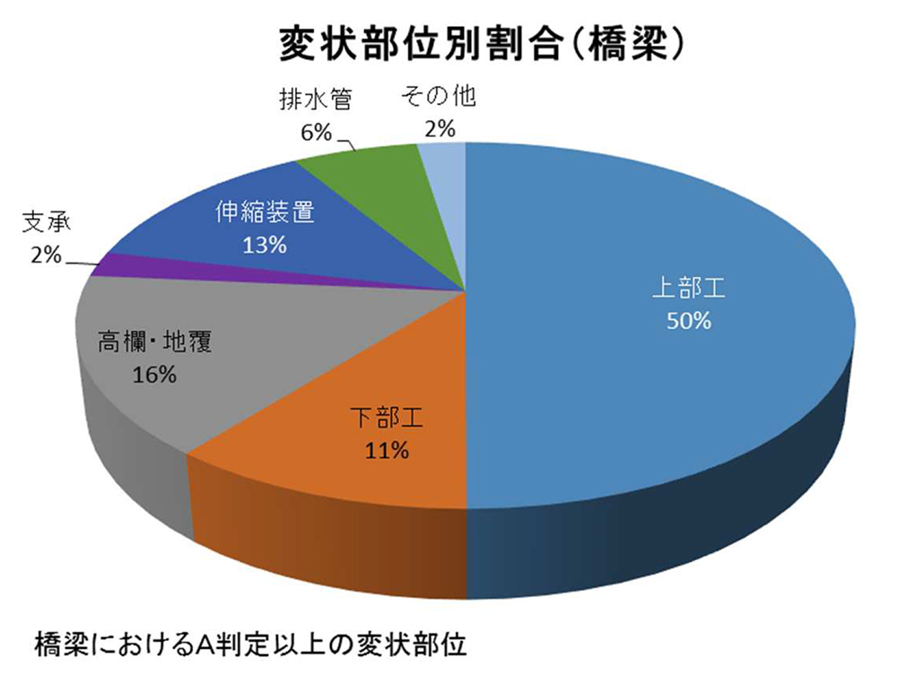橋梁の部位別では上部工に全体の半数を占める変状が発生していて、次いで高欄・地覆、伸縮装置、下部工の順に変状が多くなっています。大型車の繰返し荷重による疲労の進展、凍結防止剤に含まれる塩水の浸透による桁腐食が顕在化しているほか、伸縮装置から凍結防止剤を含んだ水が桁端部や下部工に流れて、支承の腐食やコンクリート部材の損傷が見られています。下部工や高欄・地覆は鉄筋被りが薄い箇所での凍結防止剤散布による塩害損傷が多い状況です。