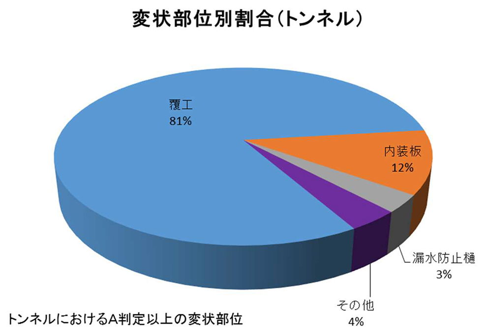 トンネルの変状については、おもに覆工コンクリートの目地部のひび割れや漏水が確認されています。
